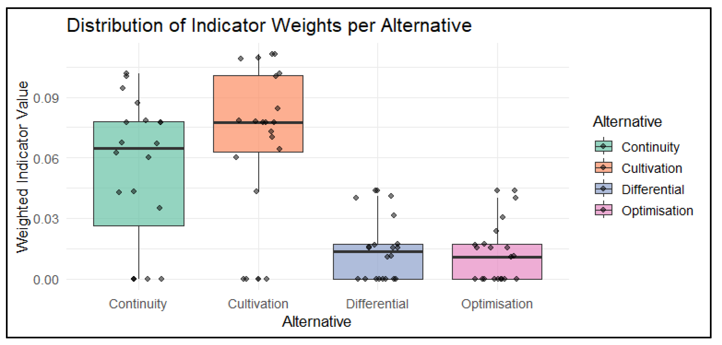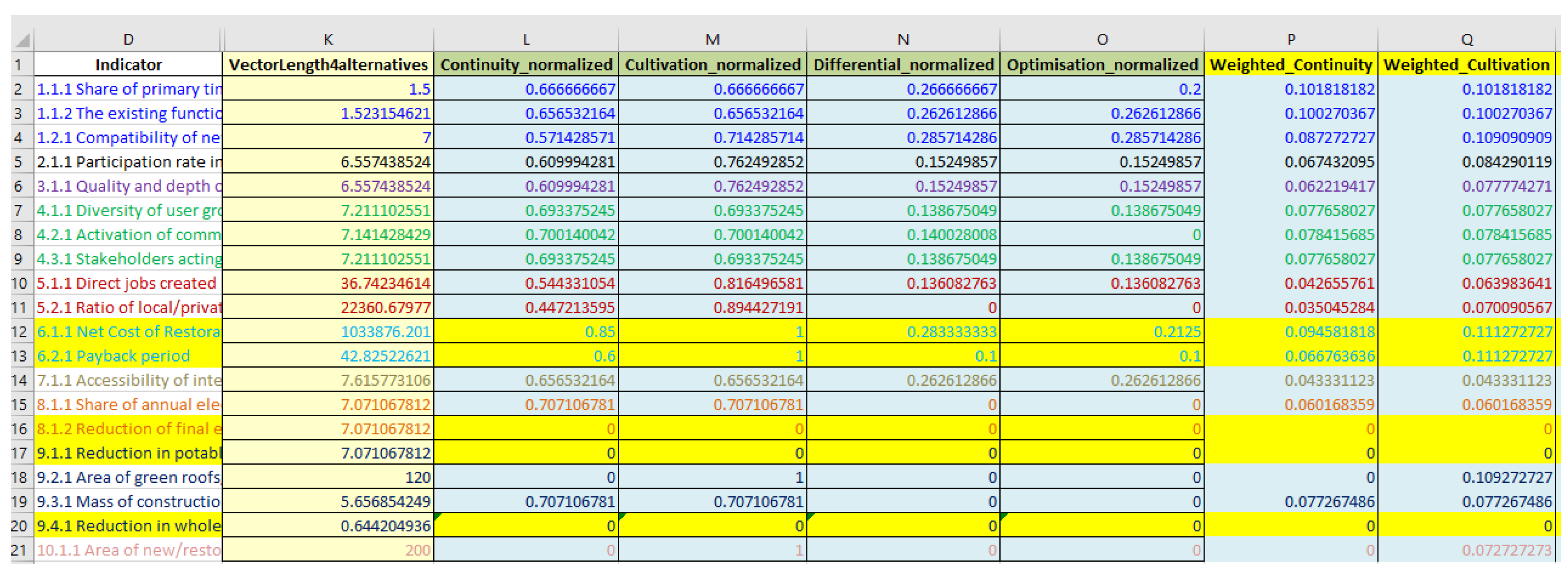 | Reduce resource consumption and environmental impacts | Green surfaces | 0.109 (Cultivation) | Cultivation | Cultivation excels in integrating green infrastructure and waste reuse strategies. |