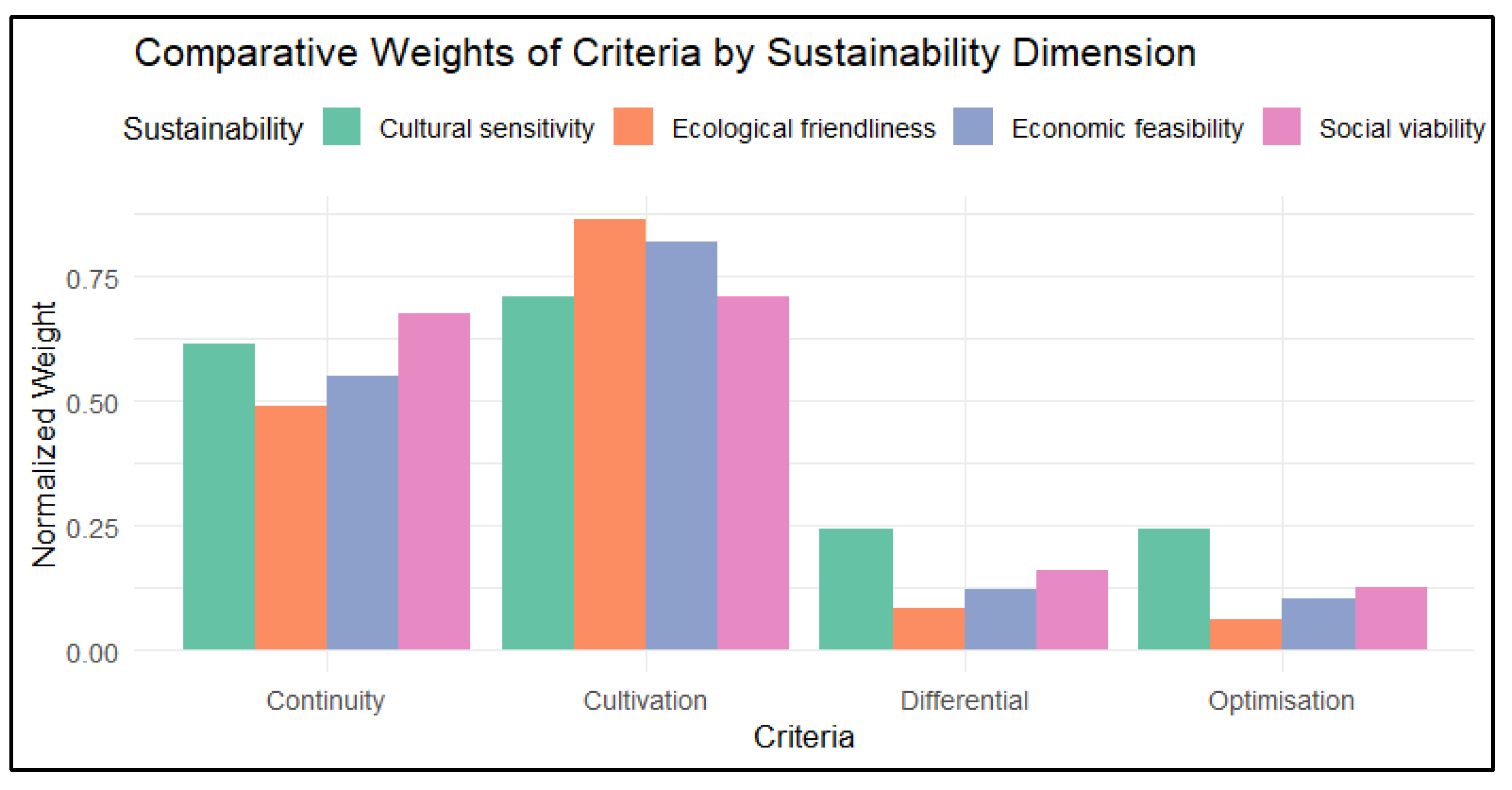 | Improve universal access and urban connectivity | Accessibility | 0.043 (Cultivation and Continuity) | Cultivation/Continuity | Both alternatives perform equally, showing consistent attention to inclusive design. |