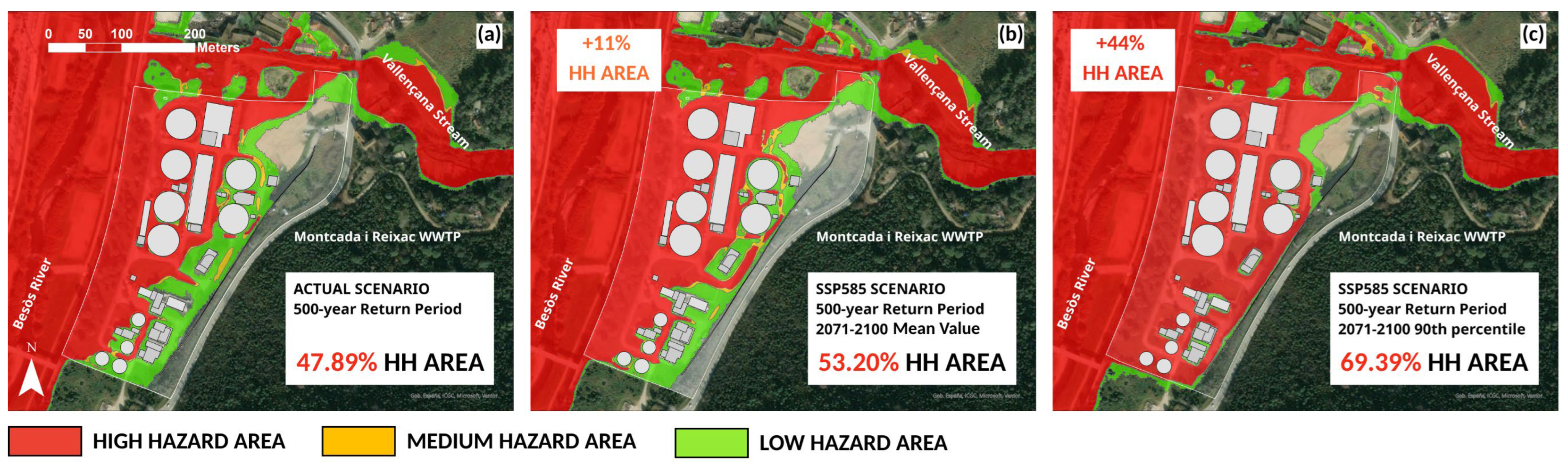 - Flor Tey, G.; Martínez-Gomariz, E.; Russo, B.; Bosque Royo, J.; Veza, E. Flood Hazard Assessment on Wastewater Treatment Plants: A Case Study of the Metropolitan Area of Barcelona (Spain). Nat. Hazards 2026, 122, 257. [Google Scholar] [CrossRef]