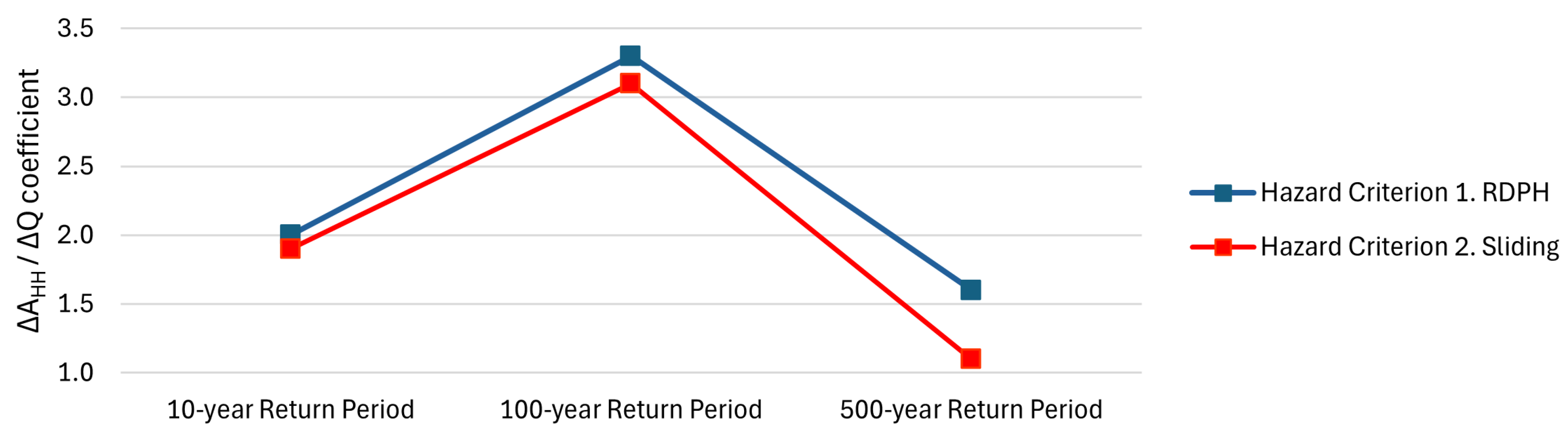 3.2. Hazard Assessment Based on RDPH (1) and Pedestrian Stability Criteria (2)