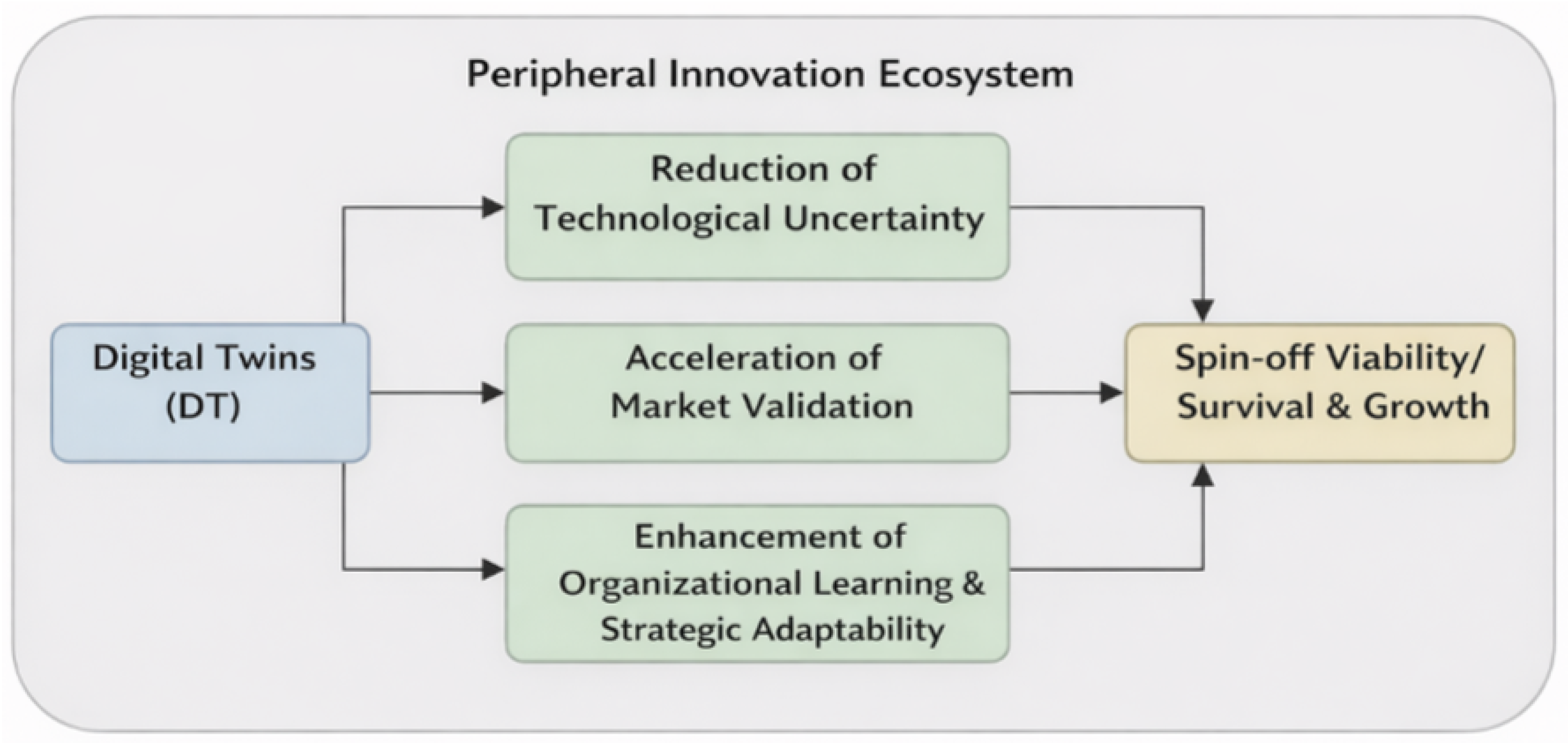 The framework demonstrates that Digital Twins may enhance spin-off performance through three interrelated mechanisms. First, they reduce technological uncertainty by enabling high-fidelity simulation, virtual testing, and iterative refinement without relying exclusively on costly physical prototyping. Second, they accelerate market validation by facilitating early stakeholder engagement, scenario-based modelling, and evidence-driven decision-making. Third, they strengthen organizational learning and strategic adaptability by embedding dynamic capability development within venture routines and enabling flexible responses to evolving technological and market conditions. Collectively, these mechanisms reposition Digital Twins as entrepreneurial infrastructures shaping capability formation, legitimacy building, and commercialization trajectories.