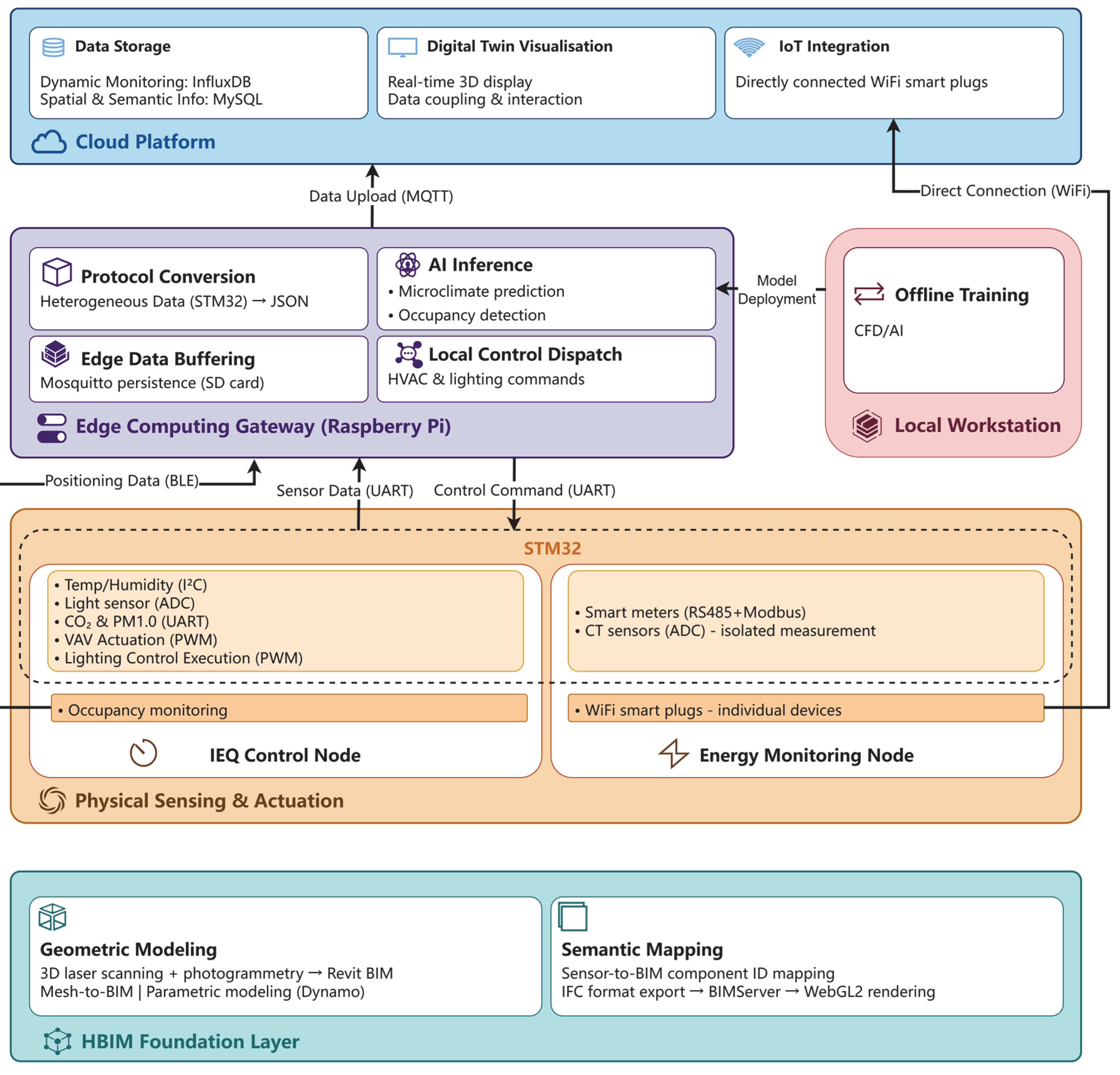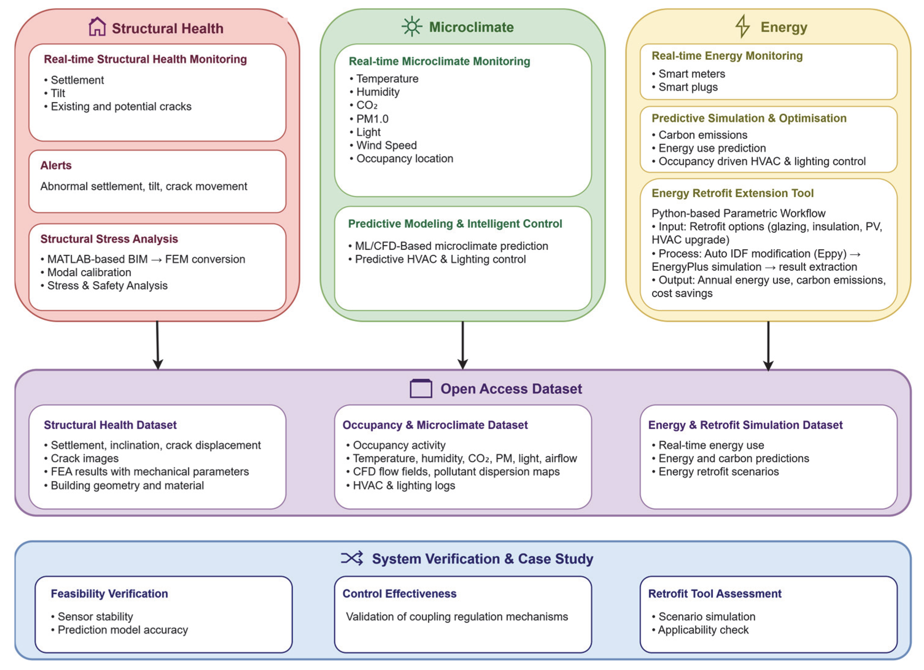 | All Domains → Open Dataset | Structural time series, crack images, FEA results; occupancy BLE traces, IAQ logs, CFD outputs; real-time energy use, retrofit simulation results | Cross-domain Research | Unified open-access dataset supports cross-domain coupling analysis, ML model training, predictive maintenance, and continuous digital twin evolution |