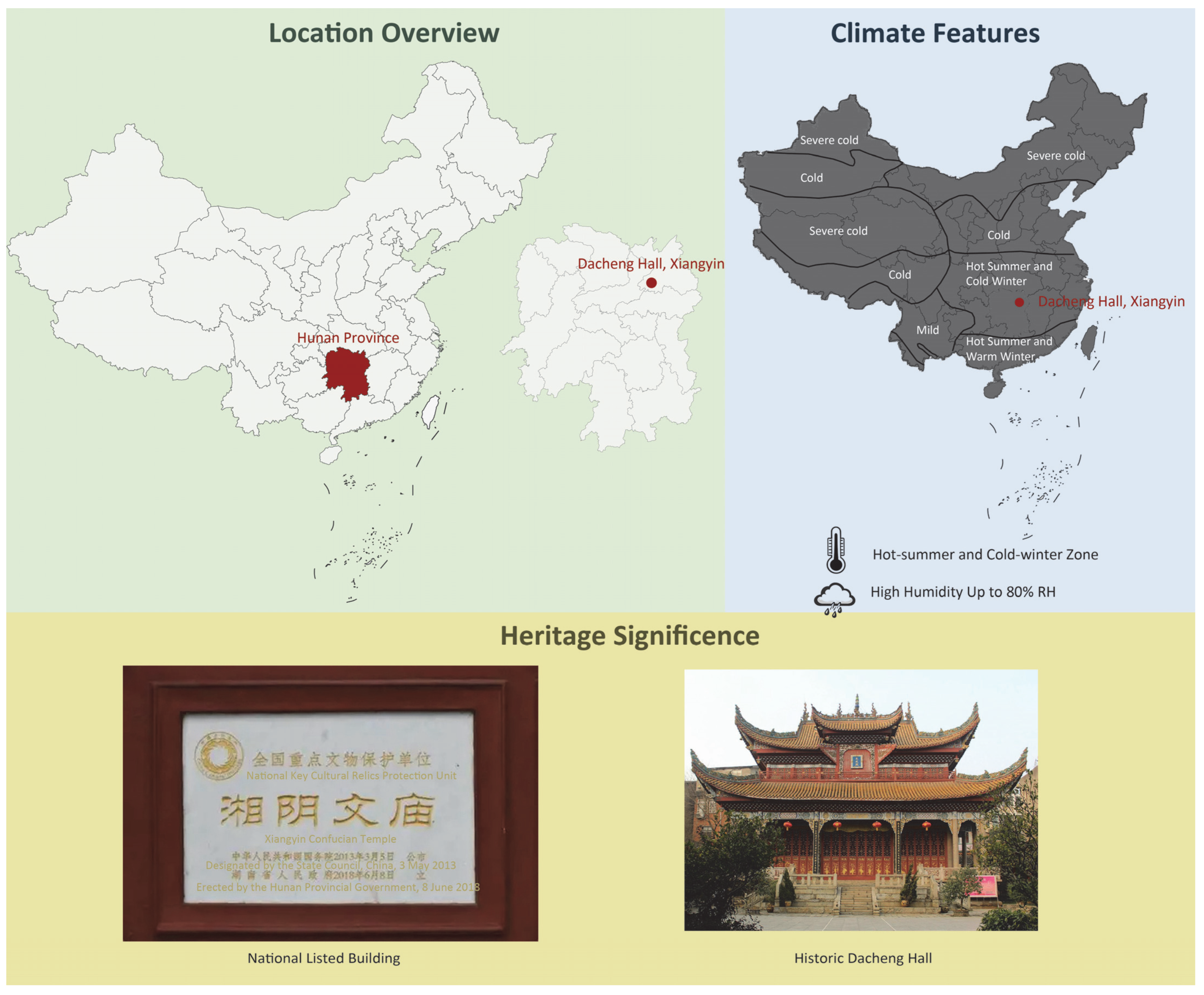- Qiu, H.; Zhang, J.; Mao, J.; Feng, X. Impact of climate change on cultural heritage buildings in hot-humid regions: Case study of Zhongde Palace, China. Build. Environ. 2025, 284, 113528. [Google Scholar] [CrossRef]