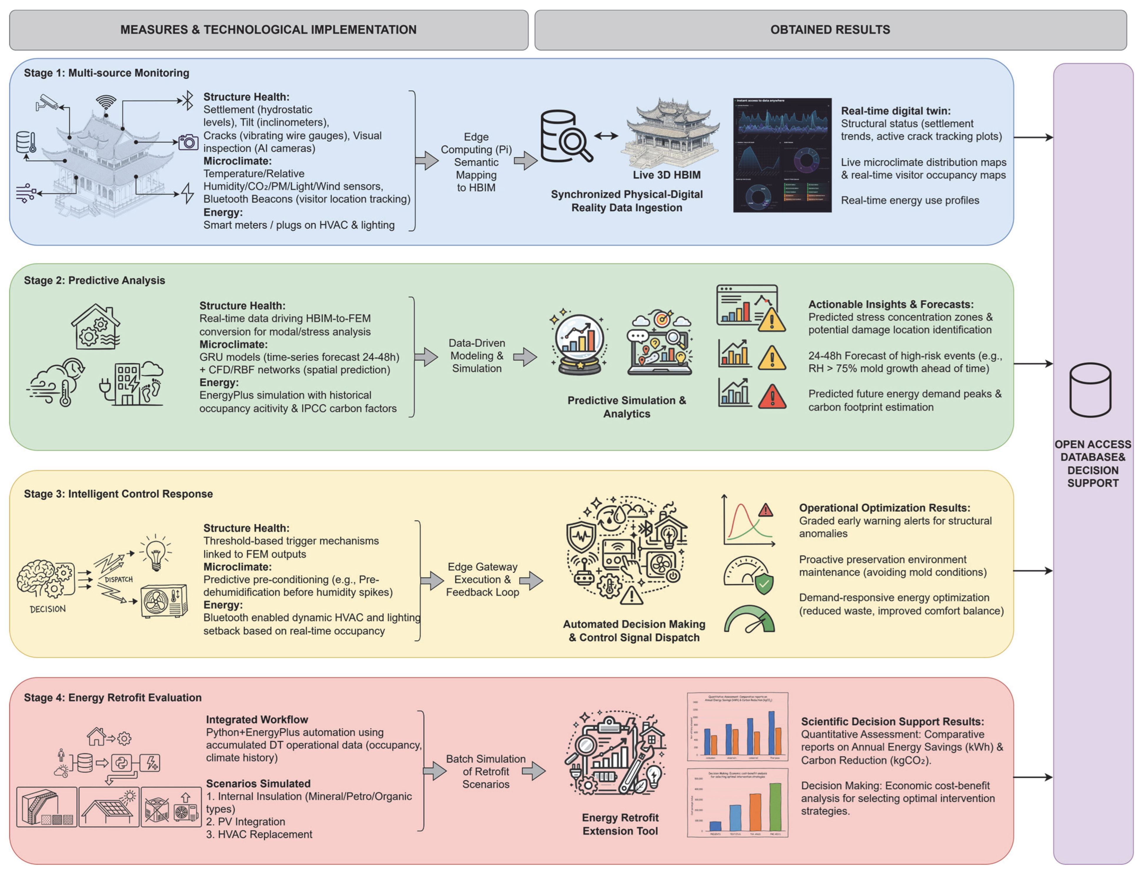 - During the operational stage, the framework proposes an intelligent regulation mechanism grounded in the coupled relationships between structural health, microclimate conditions, and energy use. Through timely adjustment of the HVAC system and related measures, the system is expected to reduce material deterioration risks and enhance occupant comfort.