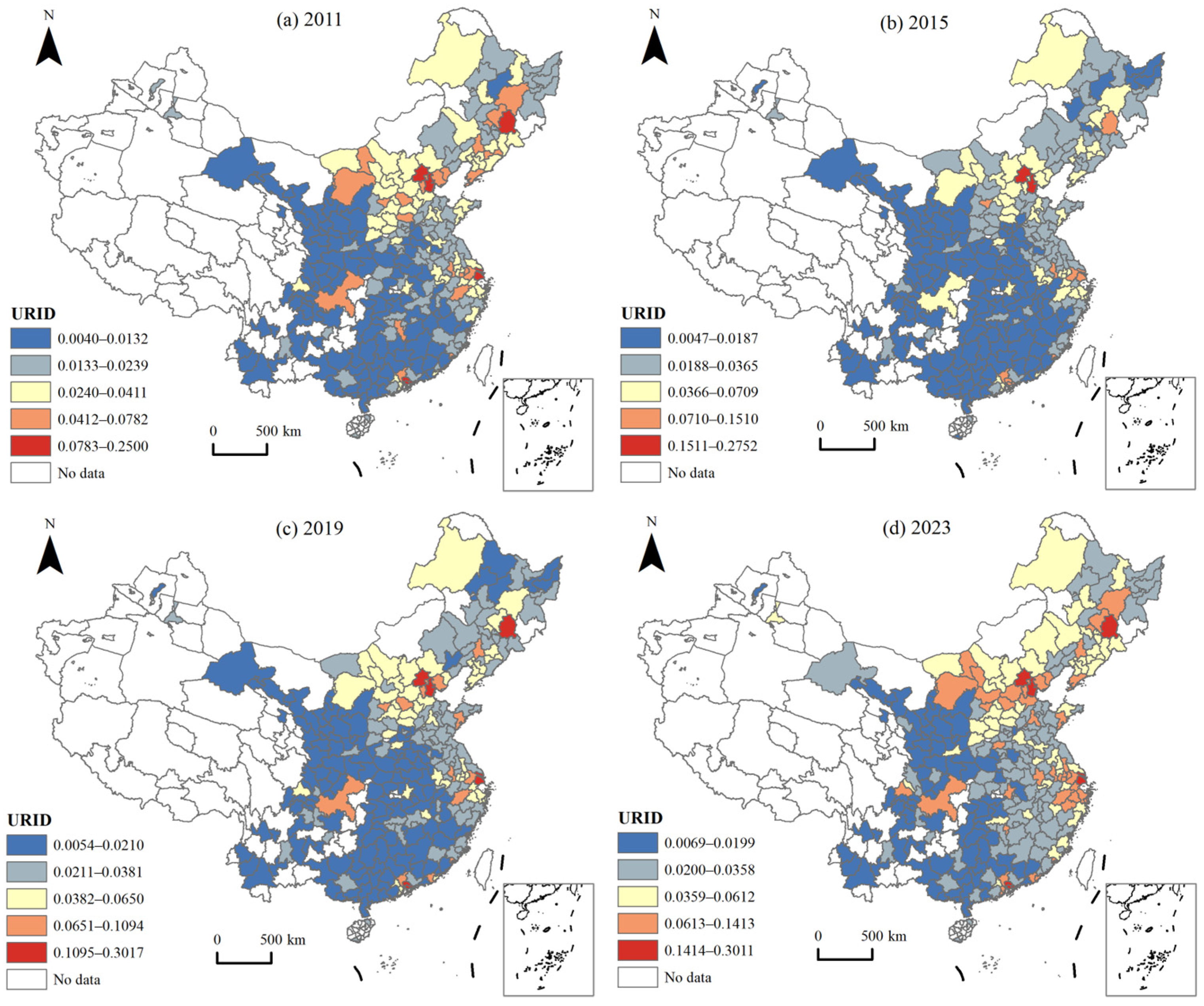 - The accelerated improvement stage (2018–2023). During this stage, URID rose rapidly from 0.0307 in 2018 to 0.0377 in 2023, with an increase of 22.80%. This may be closely related to the major transformation of national development strategies in recent years. The 19th National Congress of the Communist Party of China proposed the “implementation of the Rural Revitalization Strategy” in 2017, taking URID as the core path to break the urban–rural dual structure. The 2018 No.1 Central Document refined the two-way flow of urban–rural factors and the integration of public services. The concentrated release of policy dividends effectively removed the institutional obstacles to URID, driving it into a rapid improvement channel. Only a small growth was observed from 2018 to 2019 due to the short-term adjustment of policy implementation, and a steady and accelerated growth has been maintained since 2020, reaching a stage peak of 0.0377 in 2023, which confirms the resilience and high-quality evolution trend of URID.