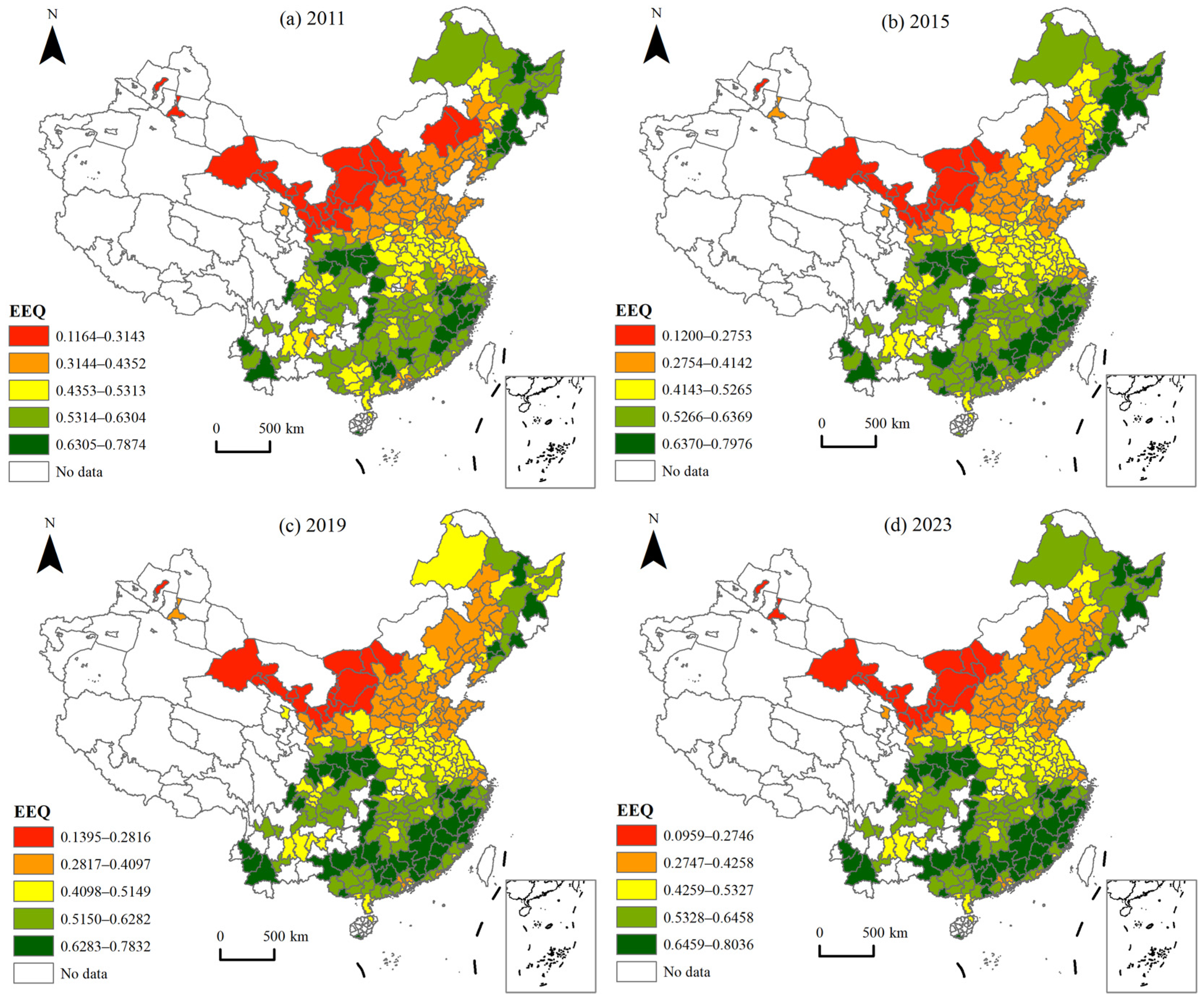 - The steady optimization stage (2020–2023). During this stage, EEQ steadily increased from 0.4943 in 2020 to 0.5078 in 2023. Its core driving force came from the deepening of the ecological civilization strategy, which was specifically reflected in the joint efforts of the normalization of the tough battle against pollution, the acceleration of industrial green transformation and clean energy, and the penetration of the concept of urban–rural green development, all of which jointly promoted EEQ into a “steady optimization” channel.
