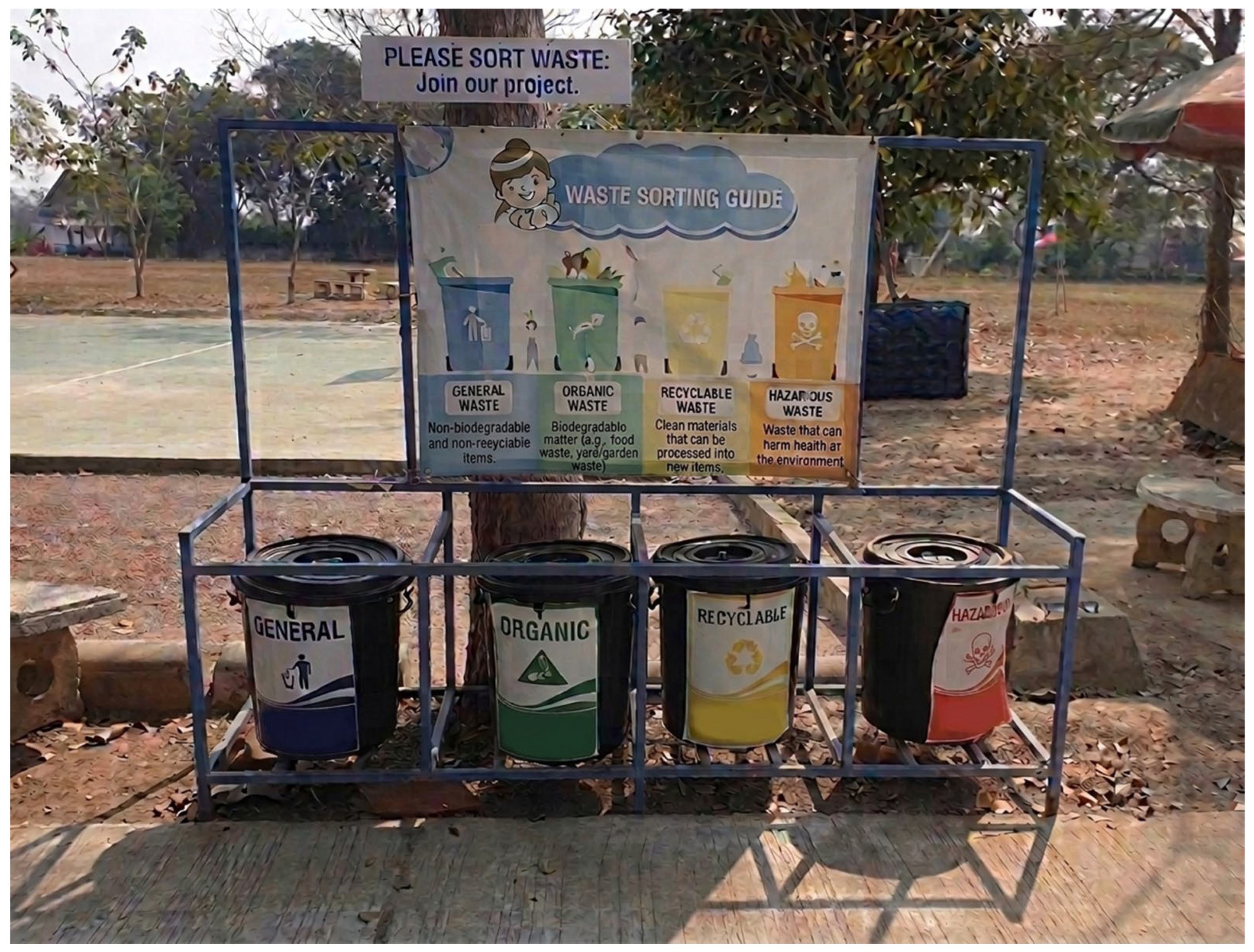 - Sapaporn, S. Promoting Municipal Solid Waste Segregation for Environmental Conservation among Students of Thesaban Ban Maed School, Talat Subdistrict, Mueang District, Maha Sarakham Province. J. Environ. Health Community Health 2017, 2, 1–9. (In Thai). Available online: https://he03.tci-thaijo.org/index.php/ech/article/view/646 (accessed on 4 August 2023).