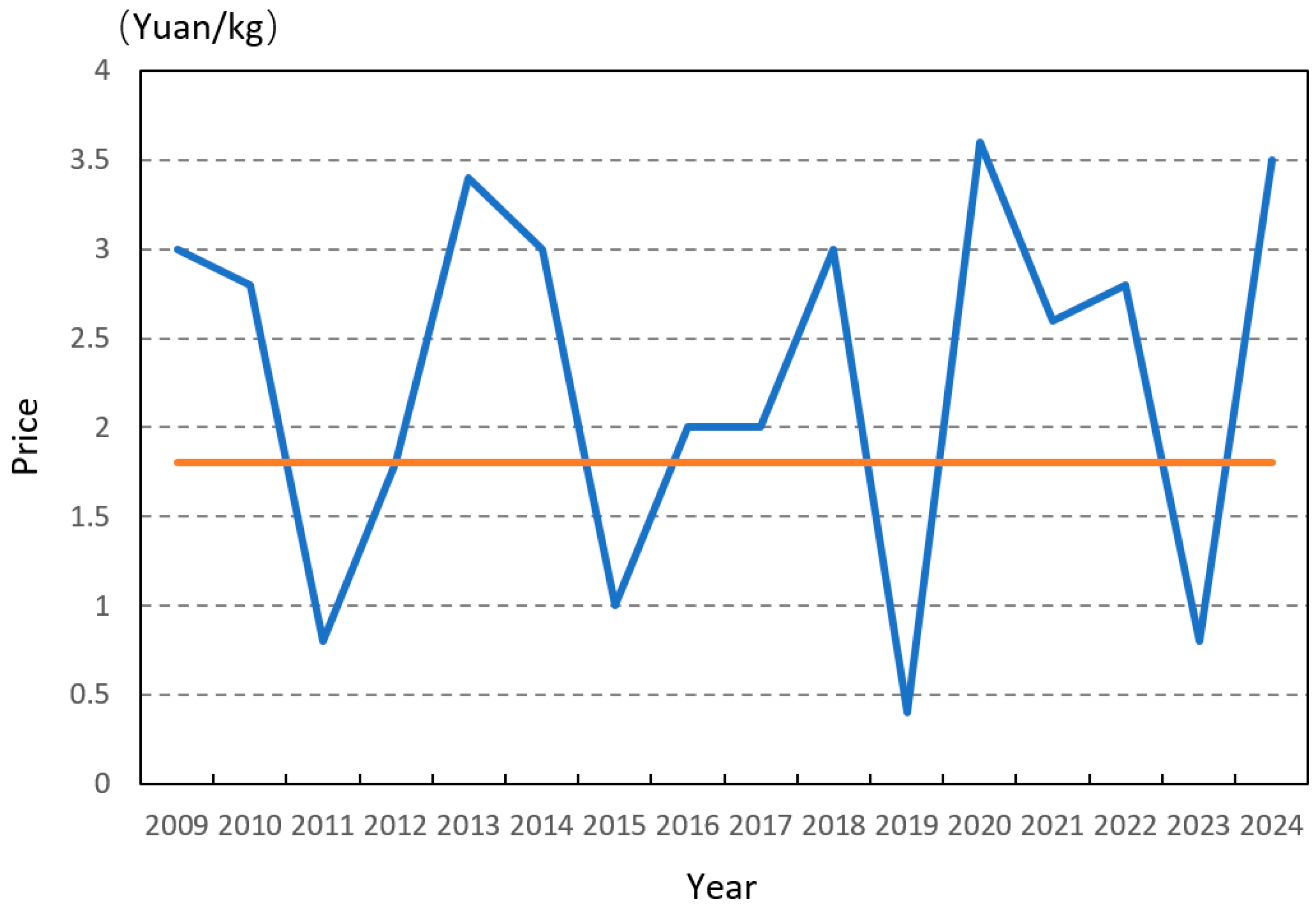 These losses prompted a reduction in the cultivation area to 10,446 ha in 2020. At this time, due to supply falling short of demand, the wholesale price rose to 1.8 yuan/kg, leading to widespread profitability for growers. After profiting, some growers, concerned that expanded cultivation the following year would lead to oversupply, ceased planting in 2021. This reduced the cultivation area to 7146 ha. The reduced area resulted in continued undersupply in October 2021, keeping the price above the break-even price and allowing growers to sustain profits.