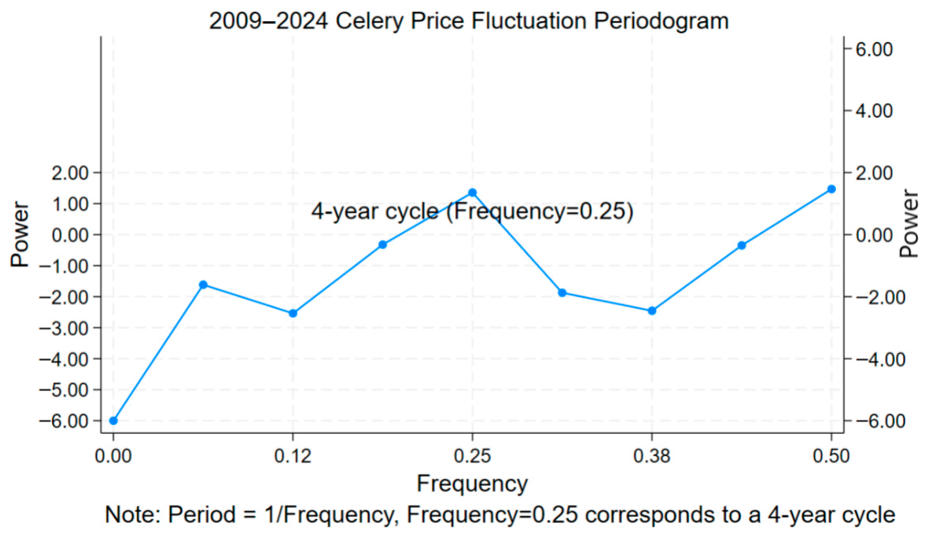 Figure 2 shows the changes in the wholesale price of celery in October each year from 2009 to 2024. Comparing the wholesale price of celery with its cost price, it is found that there is a cycle in the fluctuation of the wholesale price of celery. In October 2011, the wholesale price of celery was 0.8 yuan/kg, lower than the break-even price of 1.8 yuan/kg. In the following years, the wholesale price of celery gradually increased, reaching a recent peak of 3.4 yuan/kg in October 2013. By October 2014, the wholesale price of celery had slightly decreased to 3 yuan/kg. In October 2015, the wholesale price once again fell below the break-even price, dropping to 1.0 yuan/kg. In order to evaluate the cycle of the price fluctuation, the spectral analysis was used, and the periodogram was calculated. The periodogram indicates that the wholesale price of celery fell below the break-even price once every four years, and the result is significant (