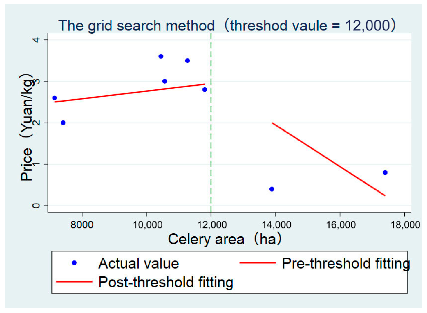 To get the threshold, the planting area was used as the independent variable, with price as the dependent variable. Using the grid search method, all possible values within the planting area range from 2017 to 2024 were systematically tested one by one in STATA. Finally, the planting area corresponding to the maximum R2 was selected as the optimal threshold.