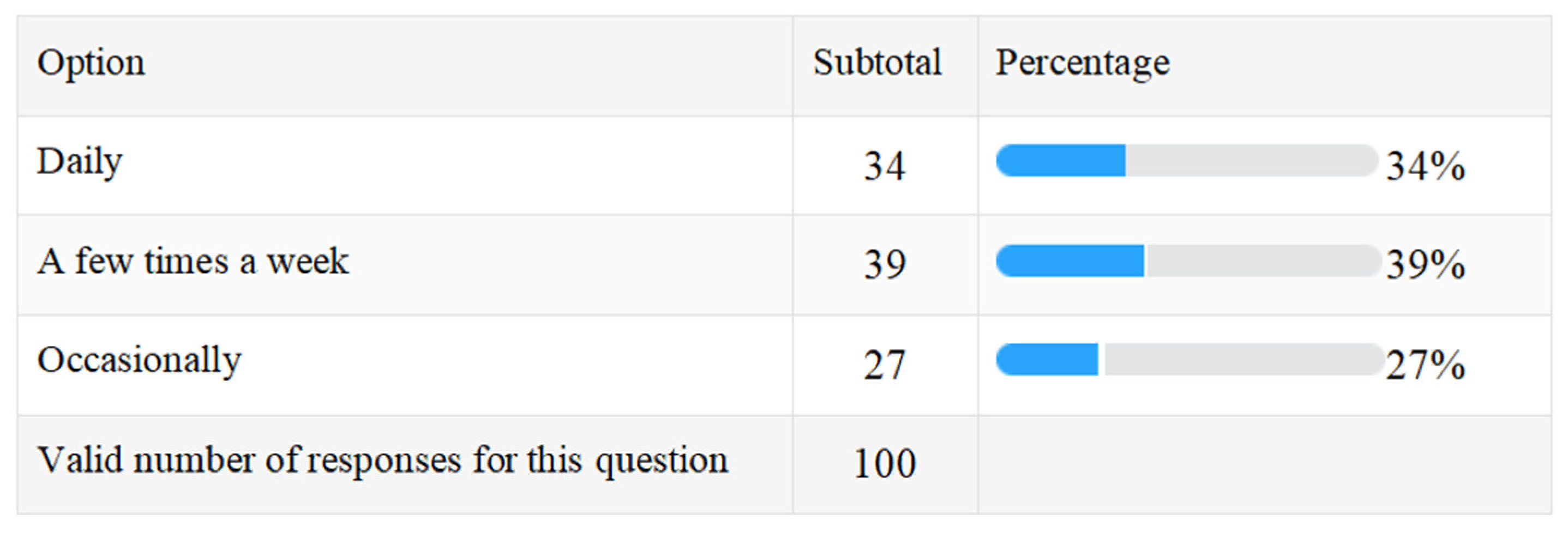 Frequency of use of the nomadic gardens (Question 4, n = 100).