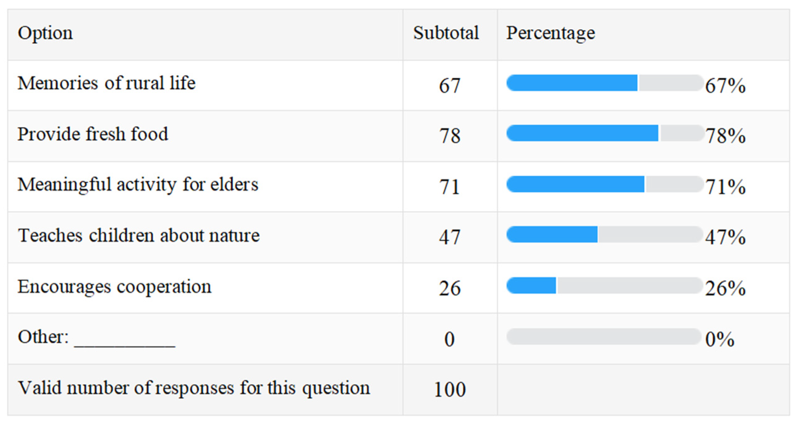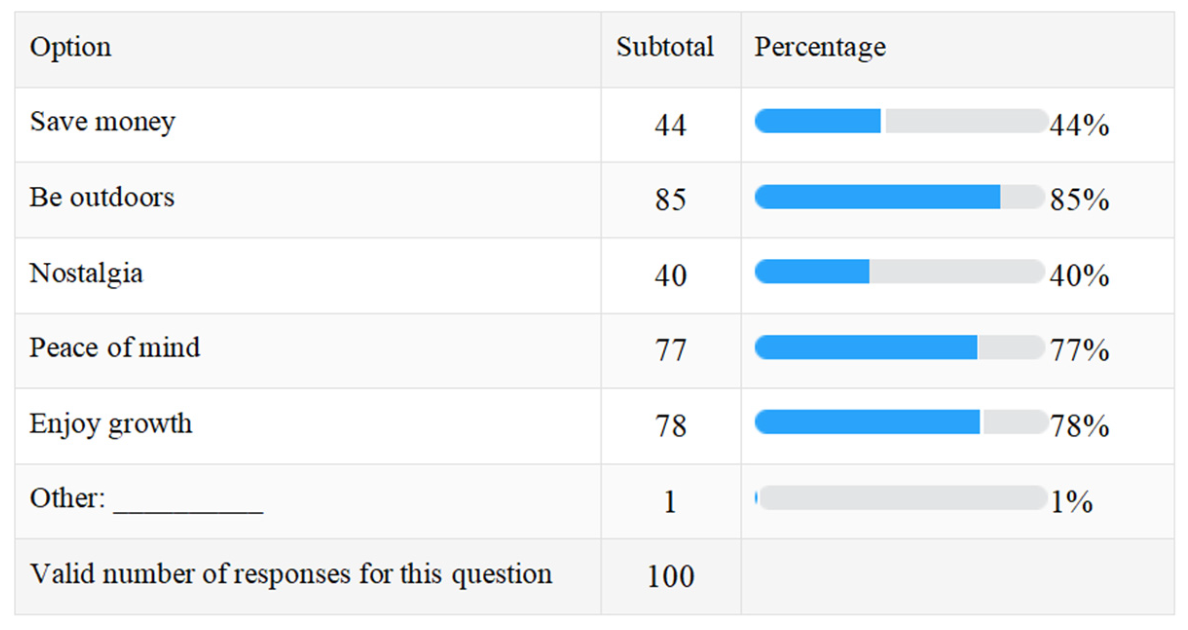 Cultural motivations for engaging in vegetable gardening (Question 12, n = 100).