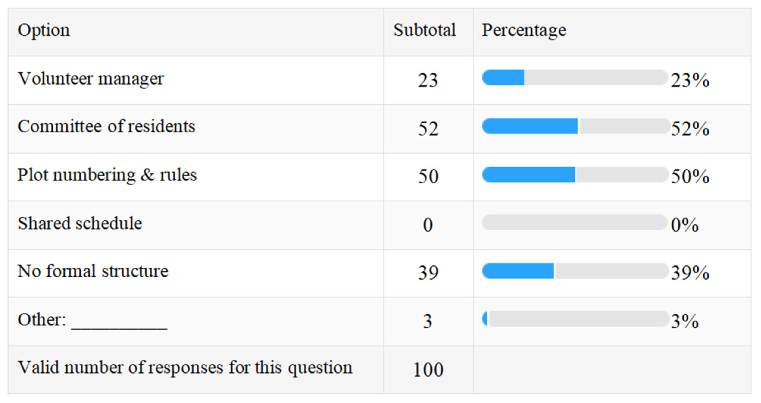 Preferred governance structures for managing the gardens (Question 17, n = 100).