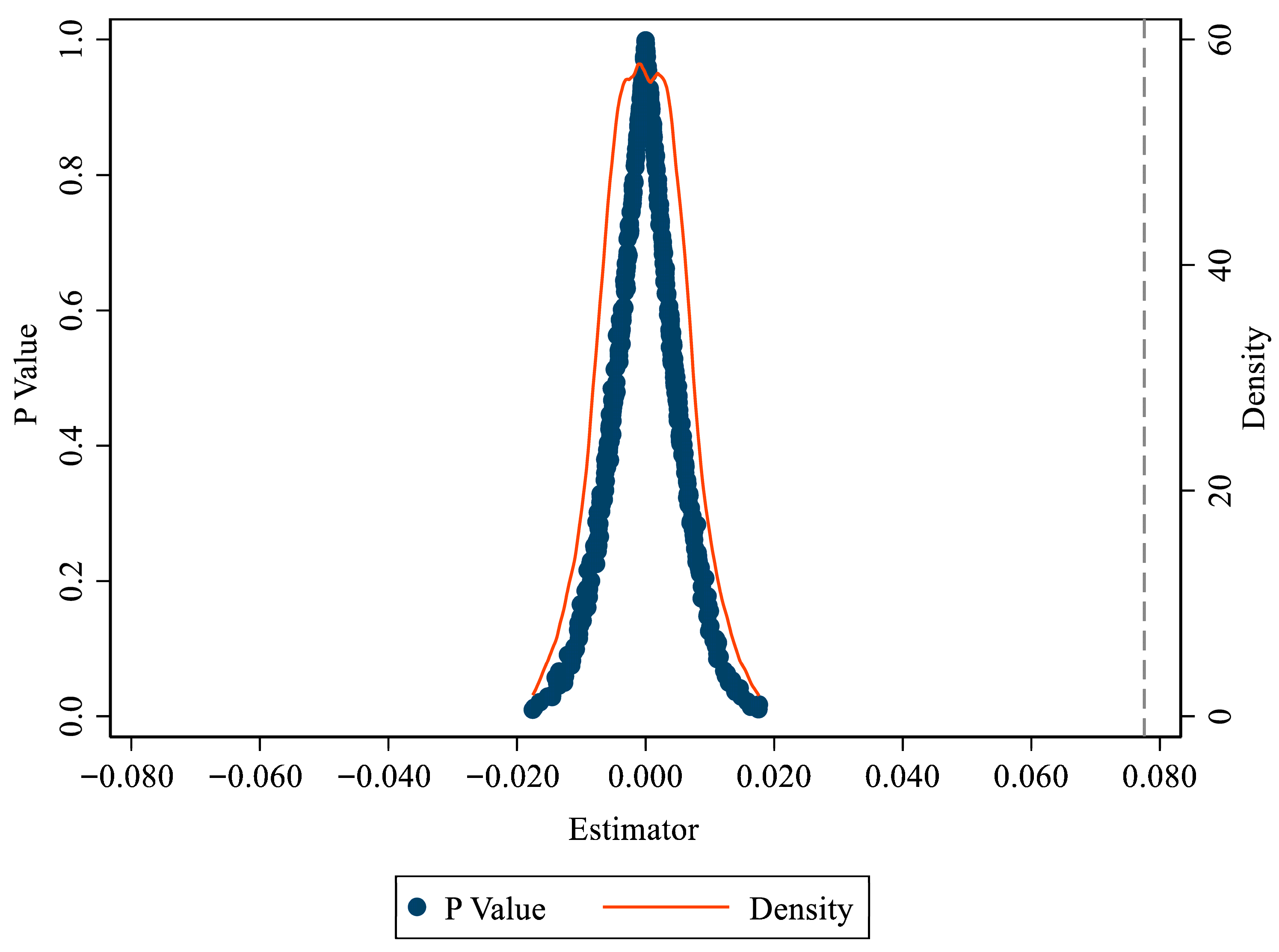 The kernel density distribution indicates that the coefficients obtained from the randomly assigned policy timings are clustered around zero, and most of the corresponding p-values are greater than 0.10. By contrast, the actual coefficient estimated from the baseline regression lies well outside this distribution and is more than three standard deviations away from the mean of the simulated coefficients. These results suggest that the randomly generated policy timings do not produce a significant effect on a firm’s TFP.