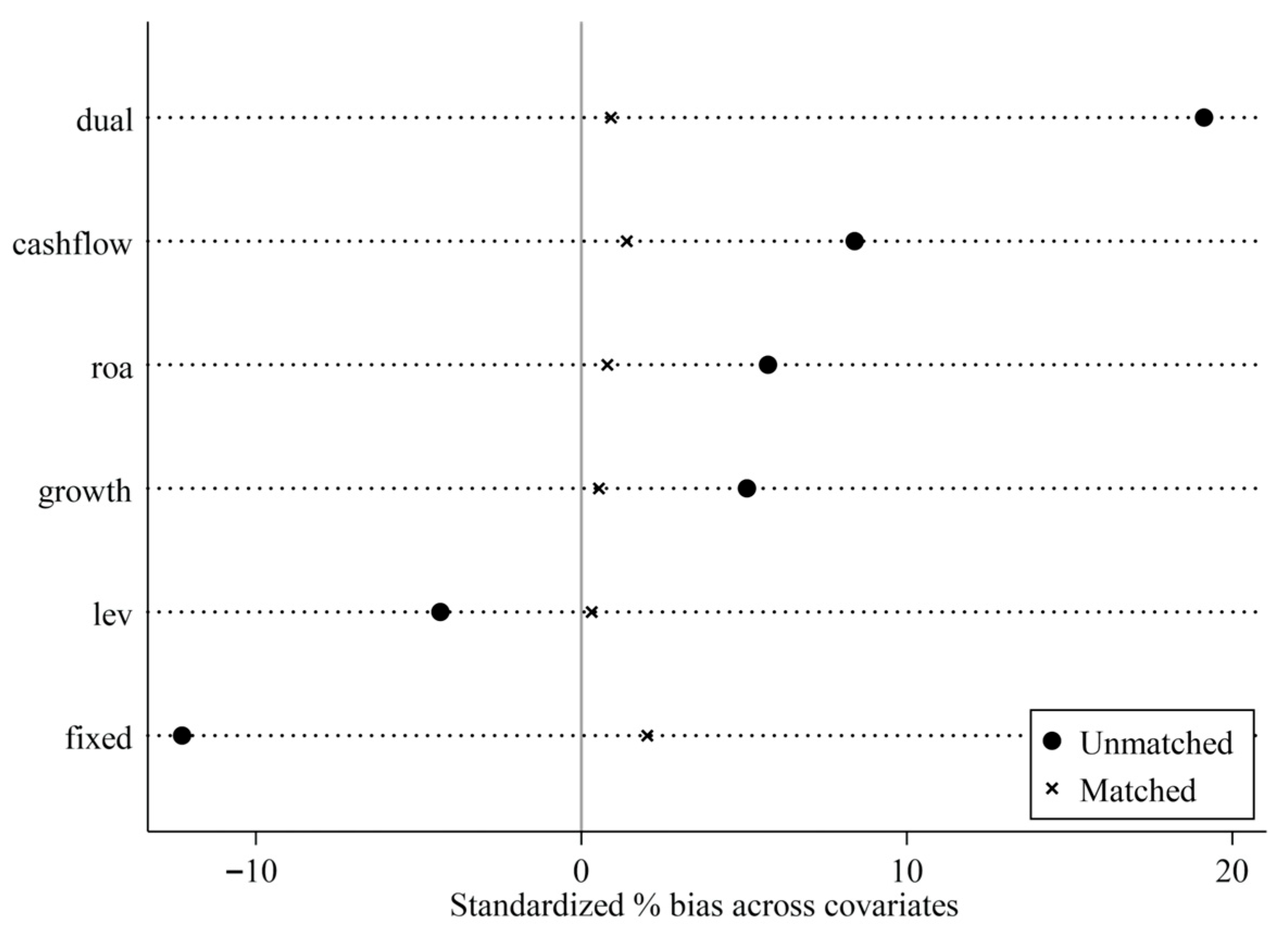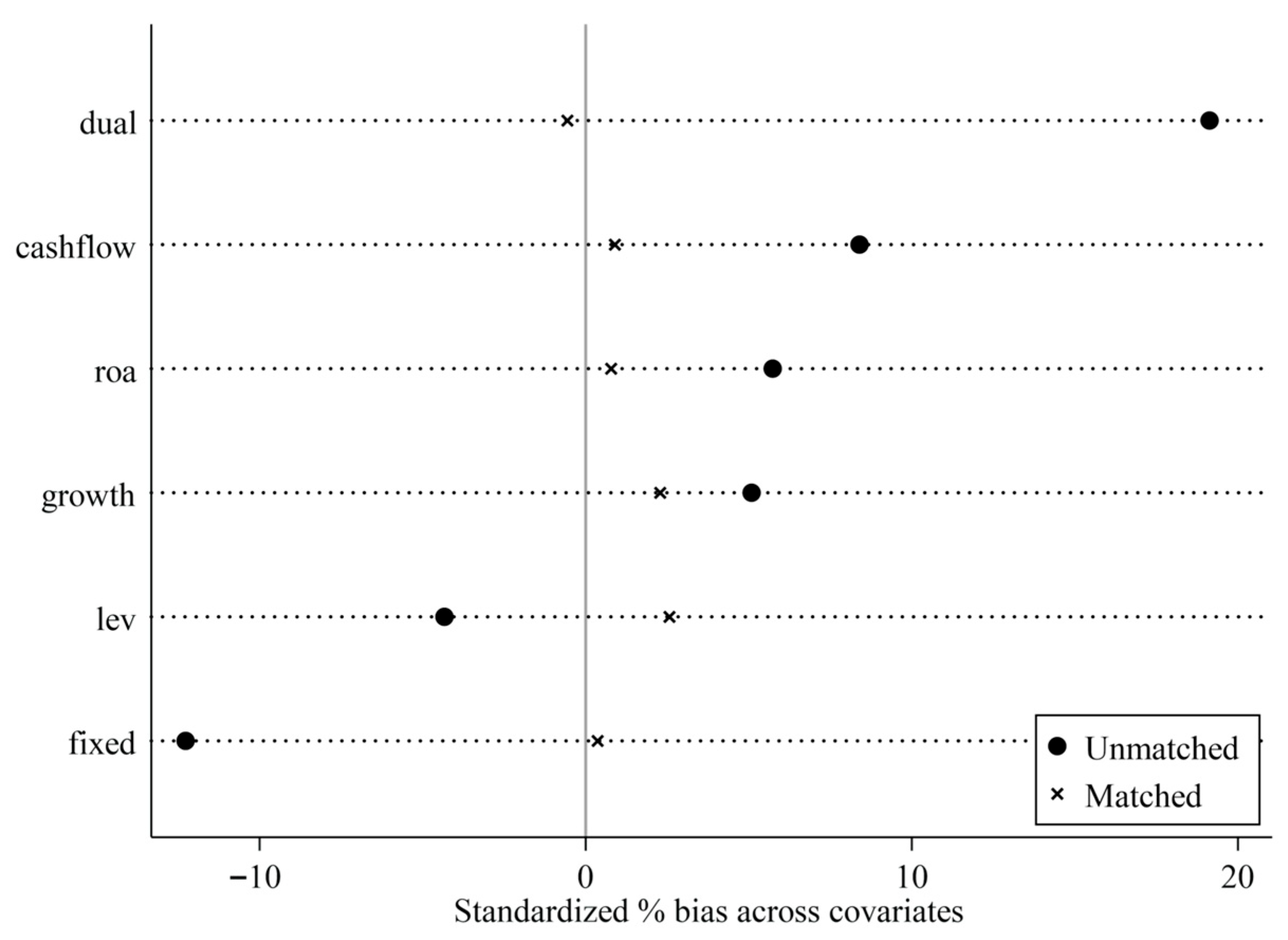 Figure 4. After the matching procedure, the standardized biases of all covariates decrease to below 10%, and it does not reject the null hypothesis, indicating that there are no systematic differences. The observable characteristics of firms in the two groups become well balanced following the matching process, indicating robust results.