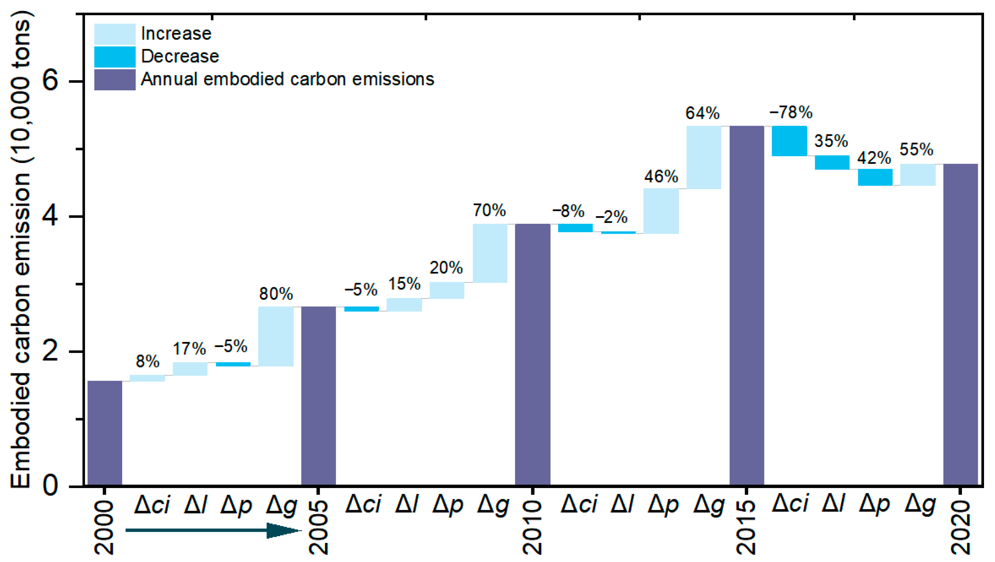 Before presenting the results, it is important to clarify what structural decomposition analysis can and cannot reveal. SDA is an accounting framework that decomposes observed changes in embodied carbon emissions into contributions from its constituent factors—carbon intensity, intermediate input structure, final demand structure, and output scale. It quantifies how much each factor contributed to the total change, but it does not, by itself, identify the causal mechanisms underlying those contributions. The historical narratives and policy interpretations offered below should therefore be understood as plausible explanations consistent with the data, not as causally validated findings. Alternative explanations may also be consistent with the observed patterns.
