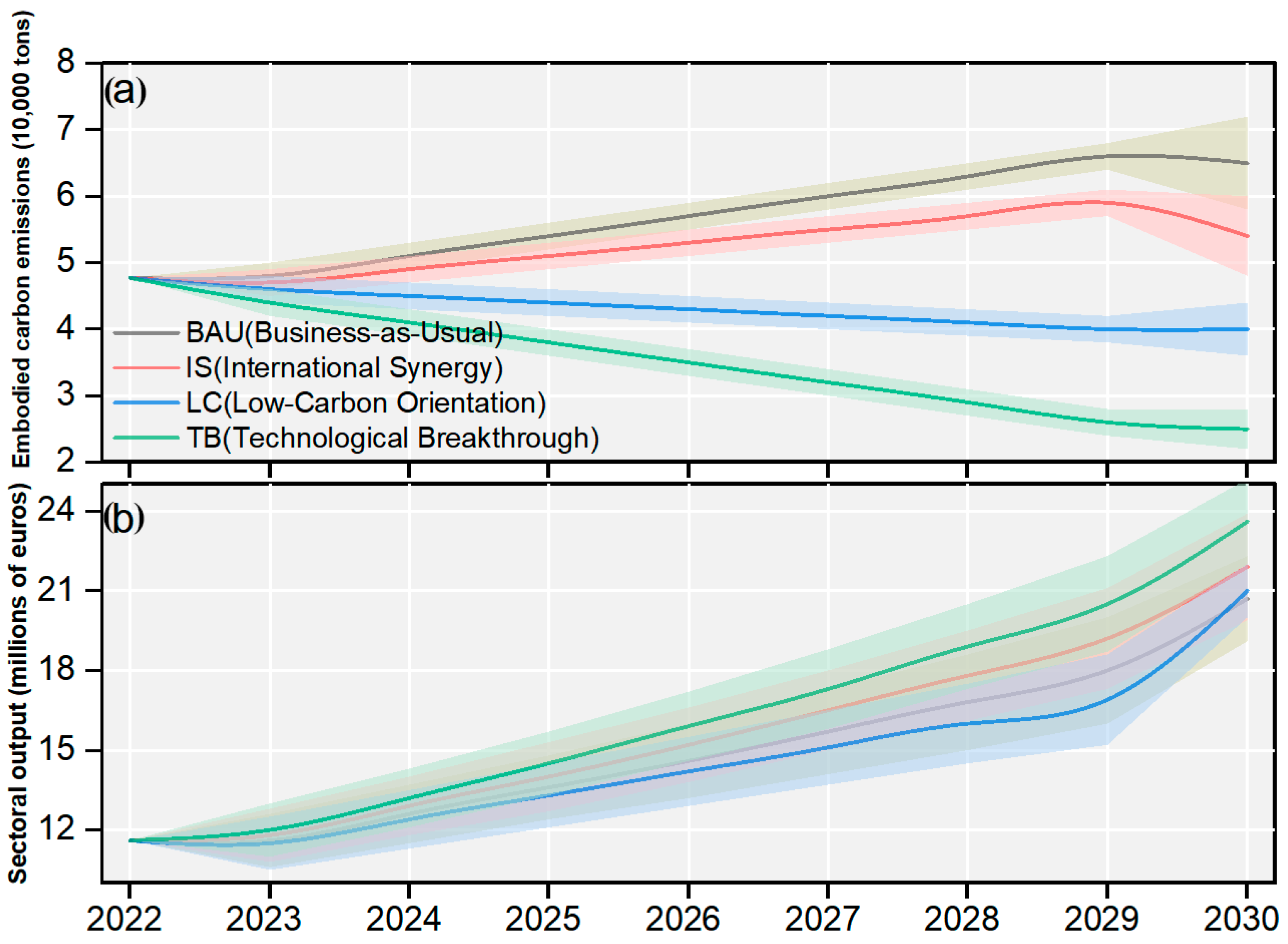 Under the International Synergy (IS) scenario, accelerated declines in carbon intensity driven by global green standards result in more moderate growth of embodied carbon emissions. By 2030, emissions reach 54 (48–60) thousand tons, representing an approximate 25% reduction compared to the BAU scenario, illustrating the potential emission reductions suggested by the IS scenario’s assumptions about international cooperation. Leveraging broader collaborative networks, this scenario achieves slightly faster output growth than BAU, with a projected 2030 output value of 21.9 (19.9–23.9) million euros, showing the output growth that would follow if the IS scenario’s market expansion assumptions were realized.