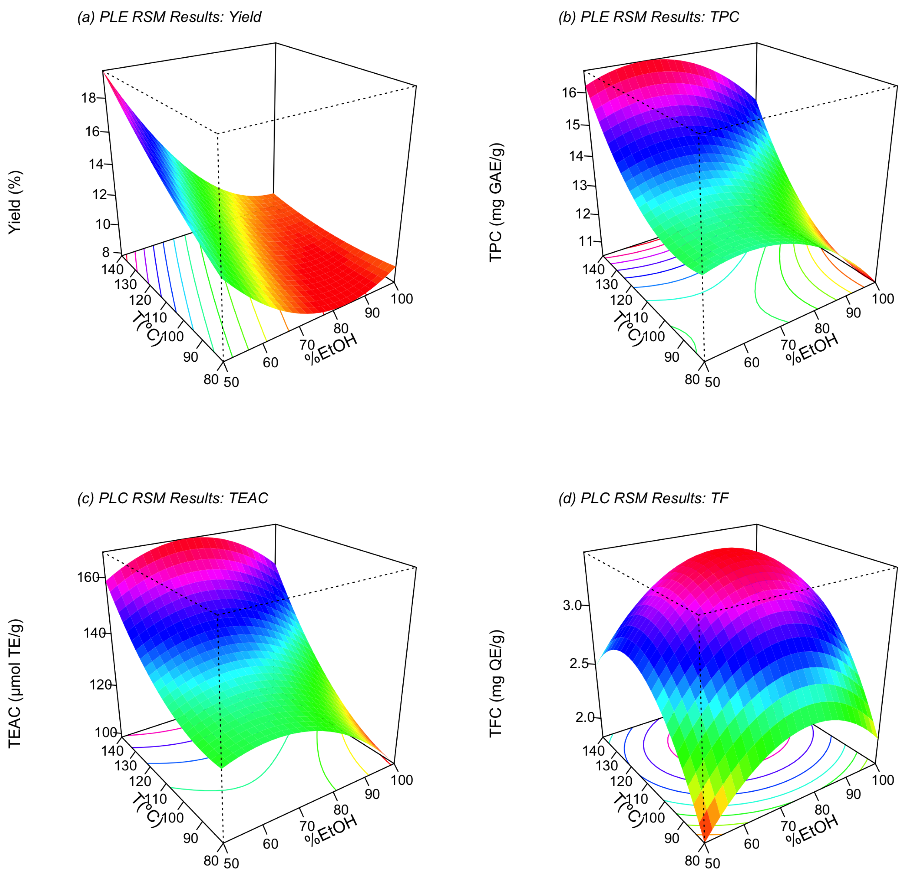 | Run | x1 | x2 | EtOH (%) | T (°C) | Yield (wt%) | TPC (mg/g) | TEAC (µmol/g) | TF (mg Q/g) |