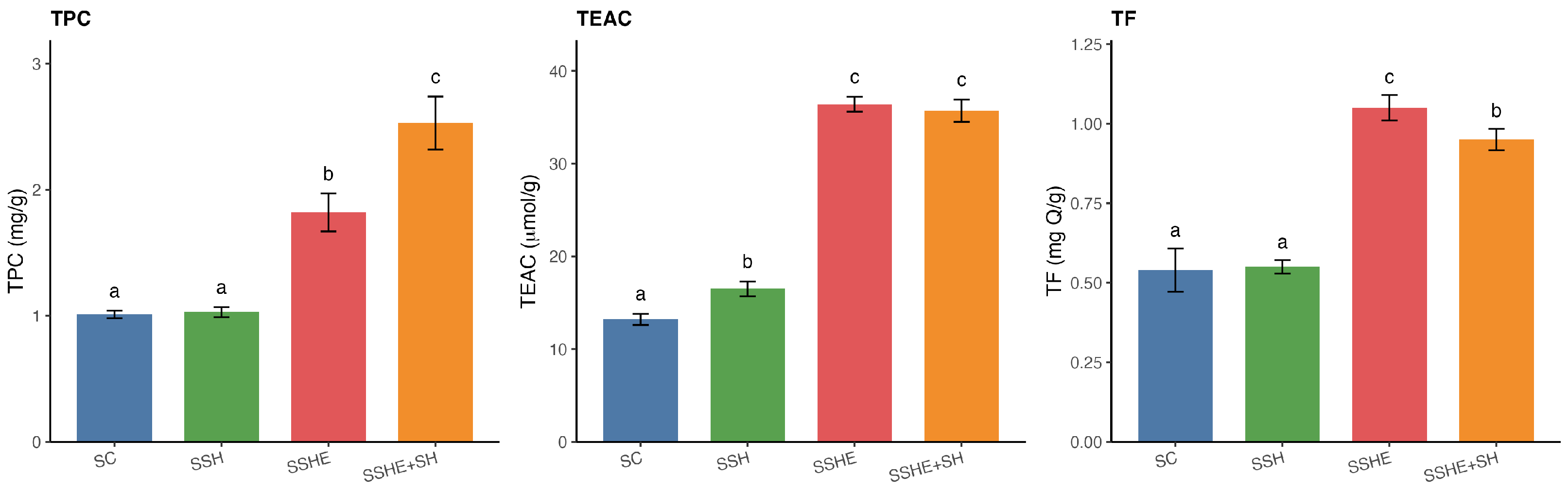 | TPC (mg GAE/g) | 1.01 ± 0.03 a | 1.03 ± 0.04 a | 1.82 ± 0.15 b | 2.53 ± 0.21 c |