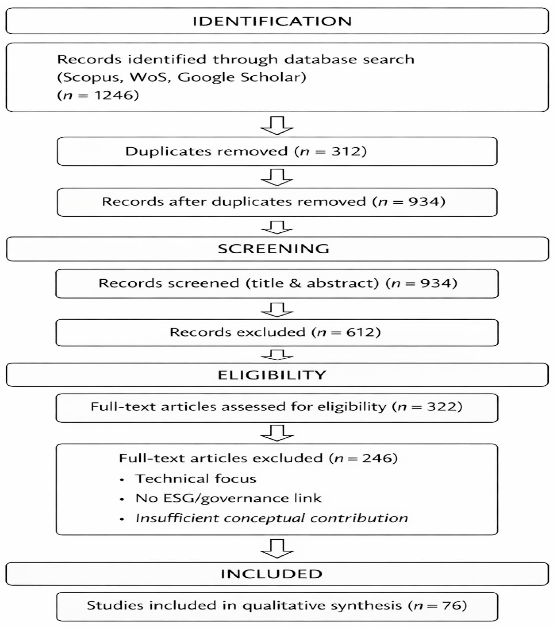 During the screening stage, 612 records were excluded due to insufficient conceptual linkage to sustainability management, ESG systems, or institutional governance.