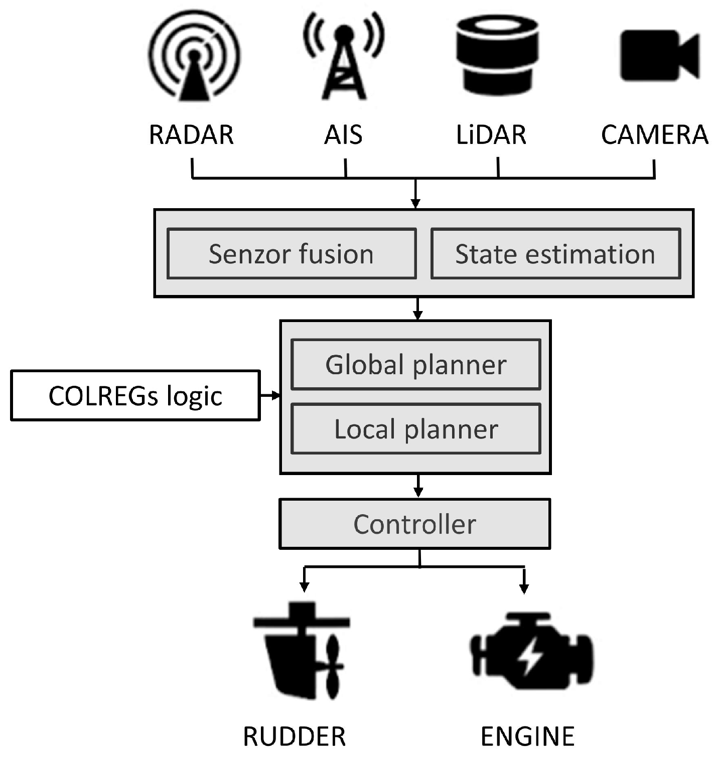 Finally, the computed control actions (rudder angle, engine rpm) are sent to the vessel’s actuators, completing the control loop.