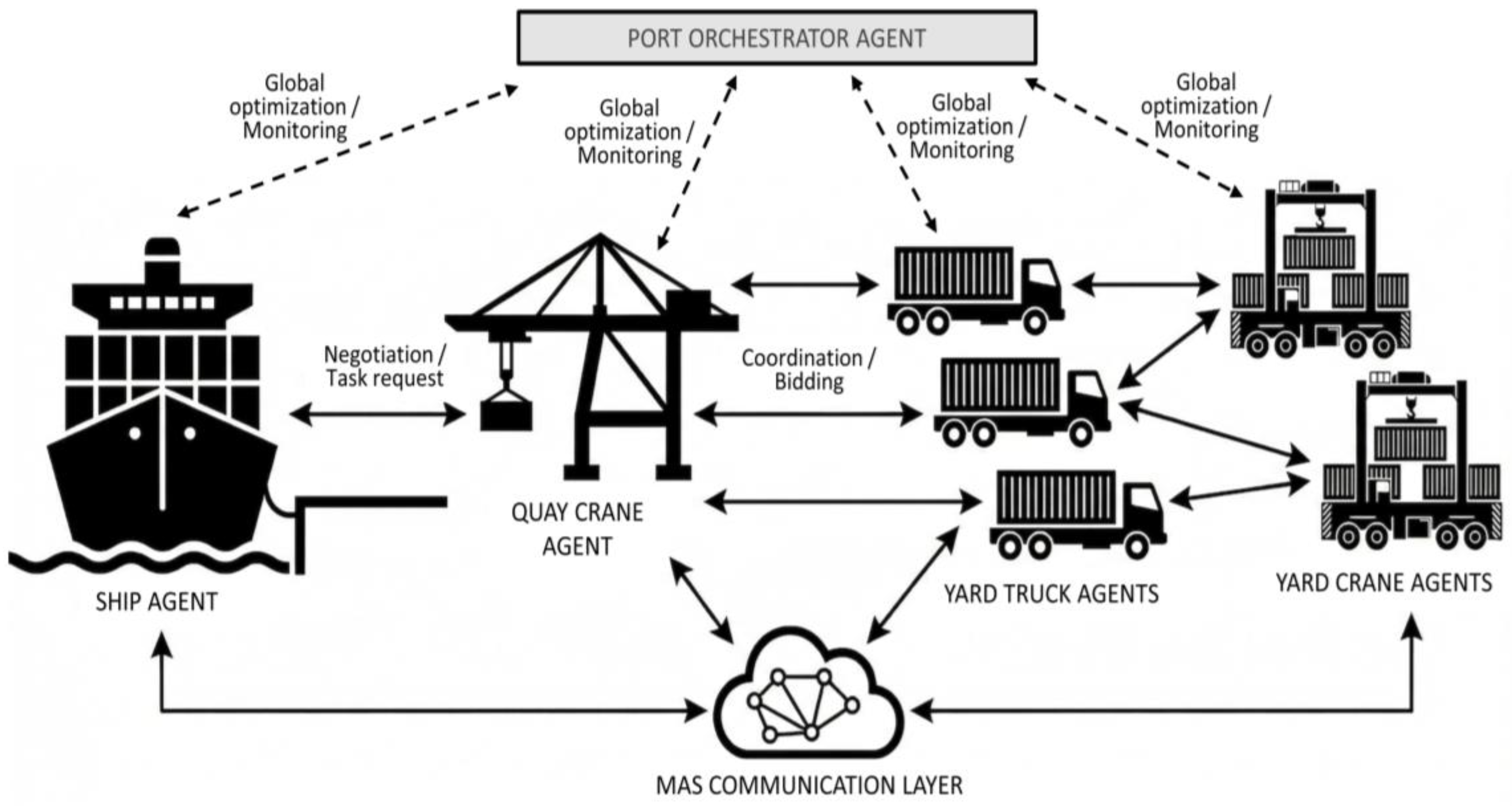 Figure 2. The diagram shows how the high-level Port orchestrator agent (which performs global monitoring) can interact with operational agents (Ship, Quay Crane, Yard Truck, Yard Crane) through negotiation and bidding protocols to dynamically assign tasks through a common communication layer. The Port orchestrator agent is responsible for global system optimization, while operational execution relies on direct negotiation between the ship agent and terminal equipment. The communication between quay cranes and yard truck agents involves the use of bidding protocols to dynamically distribute transport tasks.