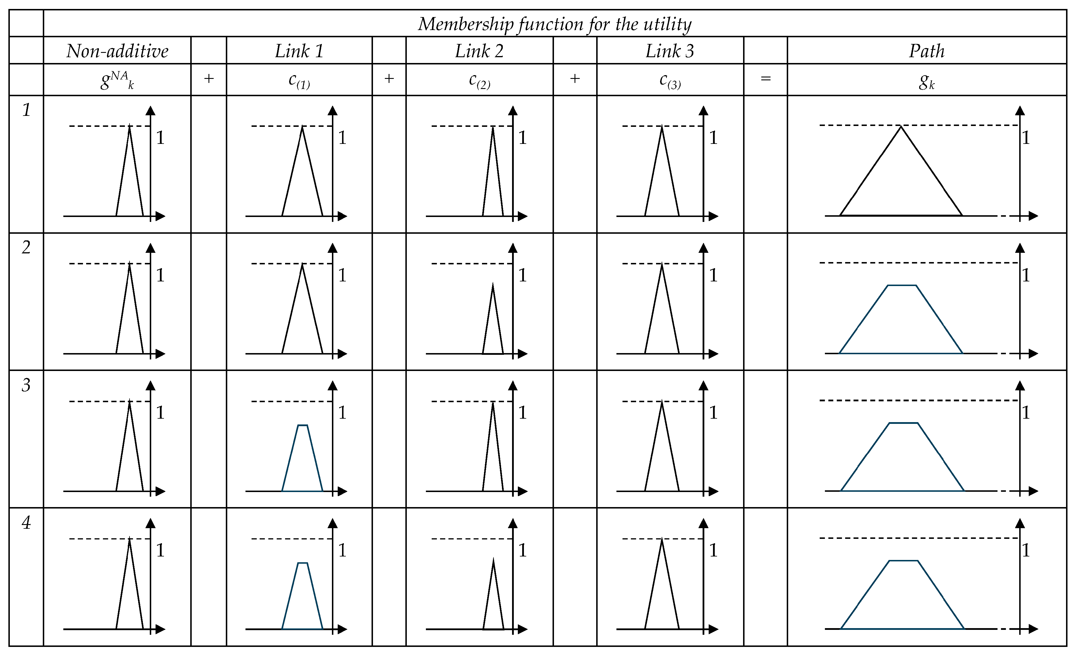 Figure 1 shows some examples of non-additive and additive links and path utility. Note that we consider sums of fuzzy numbers that could have a confidence level of less than one. The case of normalised fuzzy numbers (confidence level equal to one) is a special case of those cases considered in the figure.