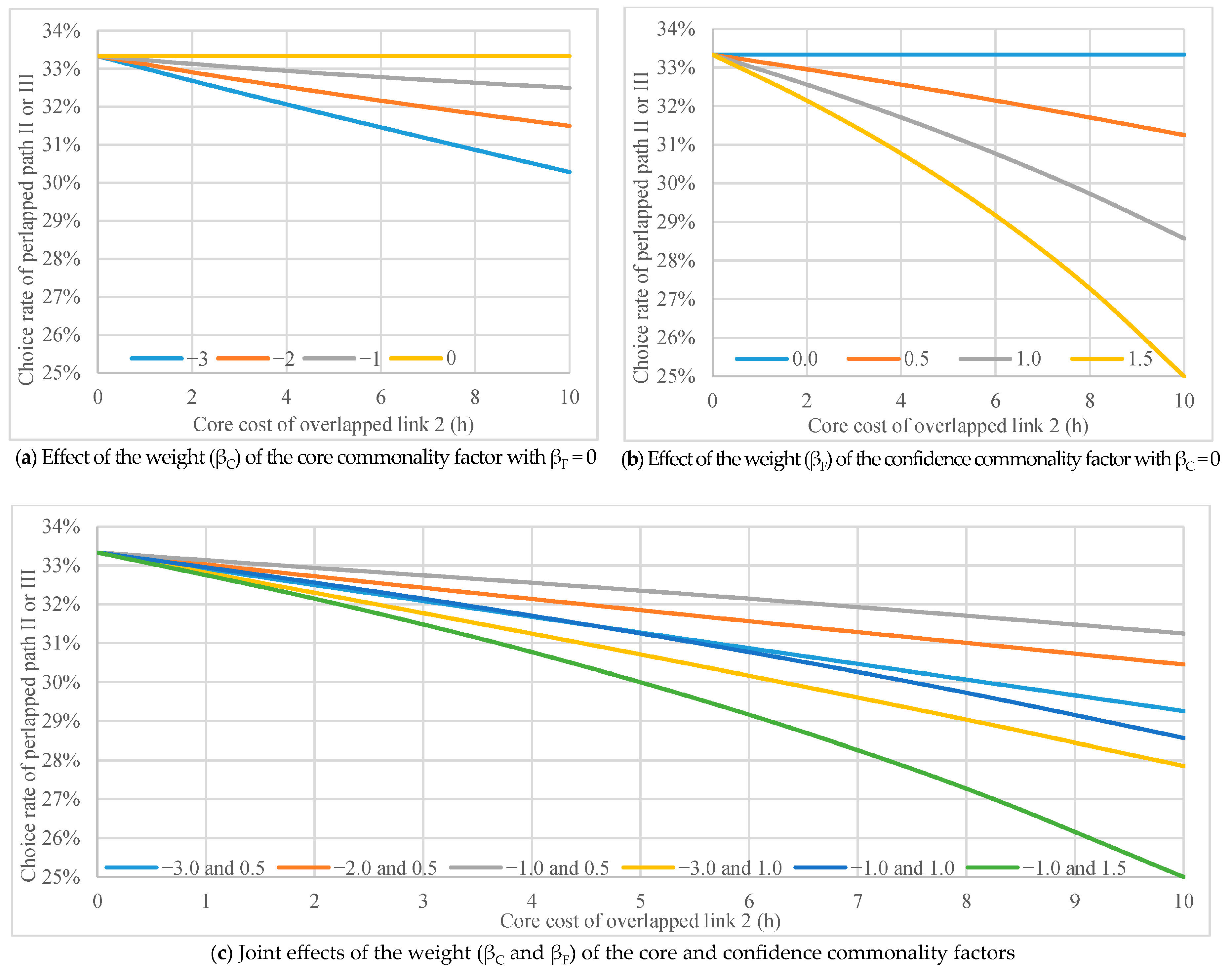 F = 0). As predicted by the theoretical model, the probability for paths II and III decreases as the cost of the overlapping link increases. Increasing the weight of the commonality factor progressively penalises solutions that share links. In the limiting case of complete overlap, the three nominal paths collapse into two independent alternatives. The probability for path II and III must be set at 0.25 (50% of the total), which is equivalent to the probability for path I (50%). Only the high weight of the commonality factor could allow for this effect.