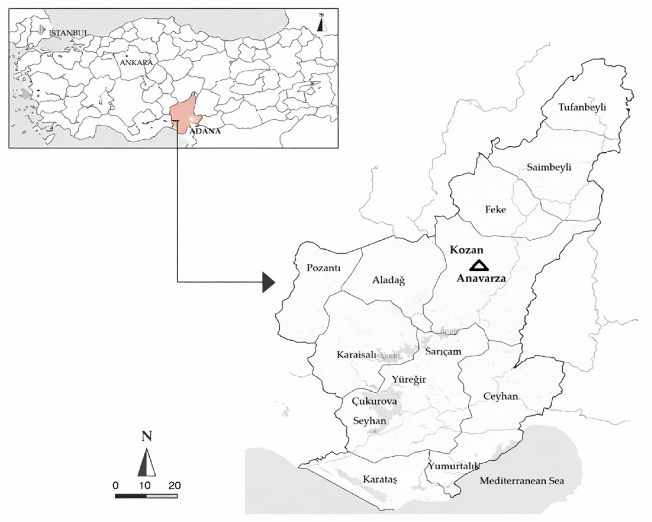 The study area comprises the spatial axis linking the metropolitan centre of Adana, the historic district of Kozan, and the archaeological landscape of Anavarza (ancient Anazarbos) in southern Türkiye (Figure 2). This territory corresponds to the historical region of Cilicia Pedias (Plain Cilicia), a fertile basin structured by the Ceyhan River system and historically integrated within inland transportation networks connecting central Anatolia to the eastern Mediterranean [22,46]. The linear configuration of these settlements forms the territorial framework within which the heritage corridor framework is operationalised.