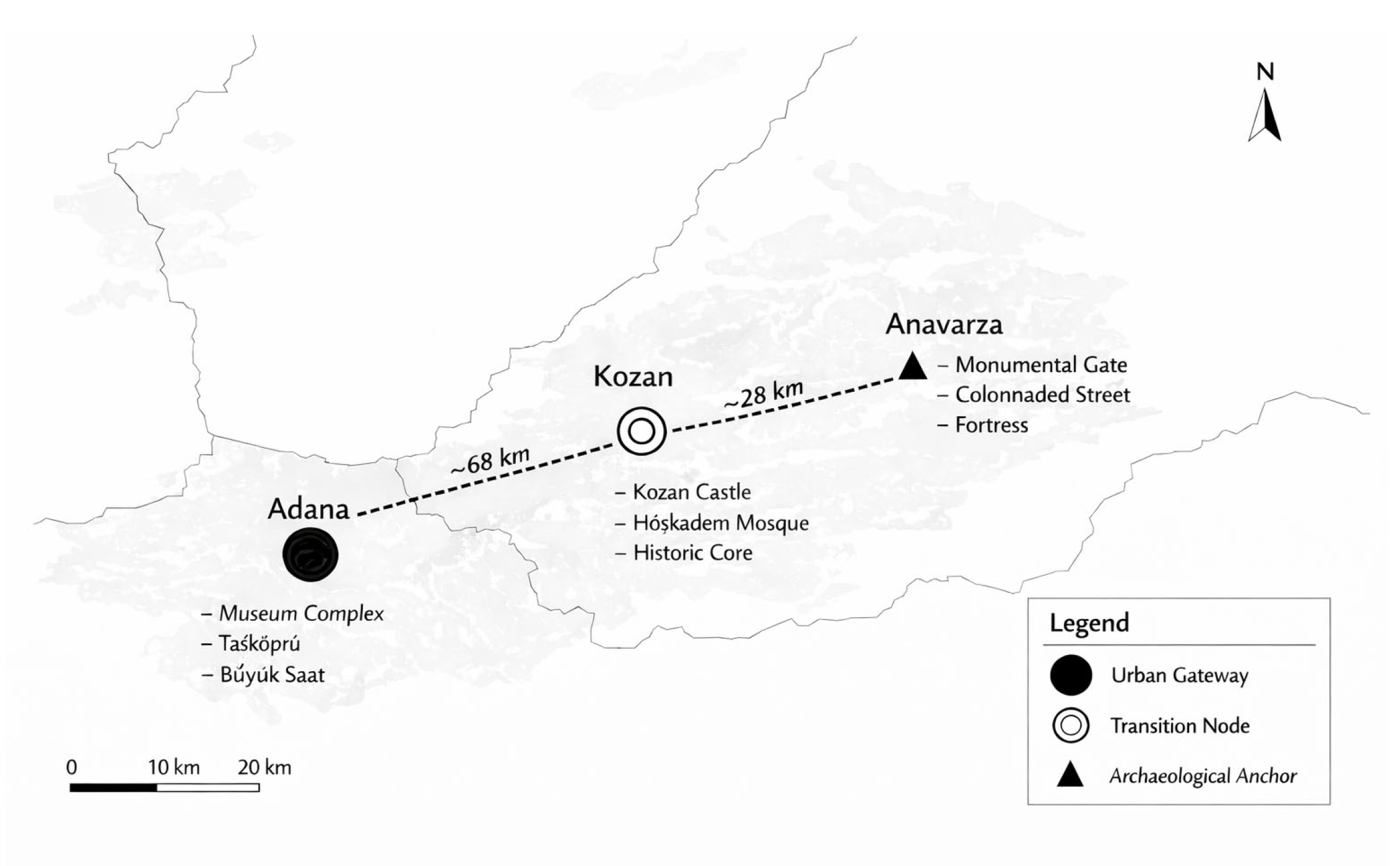 Figure 4. Spatial axis and hierarchical node structure of the Adana–Kozan–Anavarza cultural corridor, illustrating gateway, transition, and archaeological anchor functions, with indicative distances between nodes. (Base map sources: OpenStreetMap contributors; visualisation and spatial overlays by the authors.).