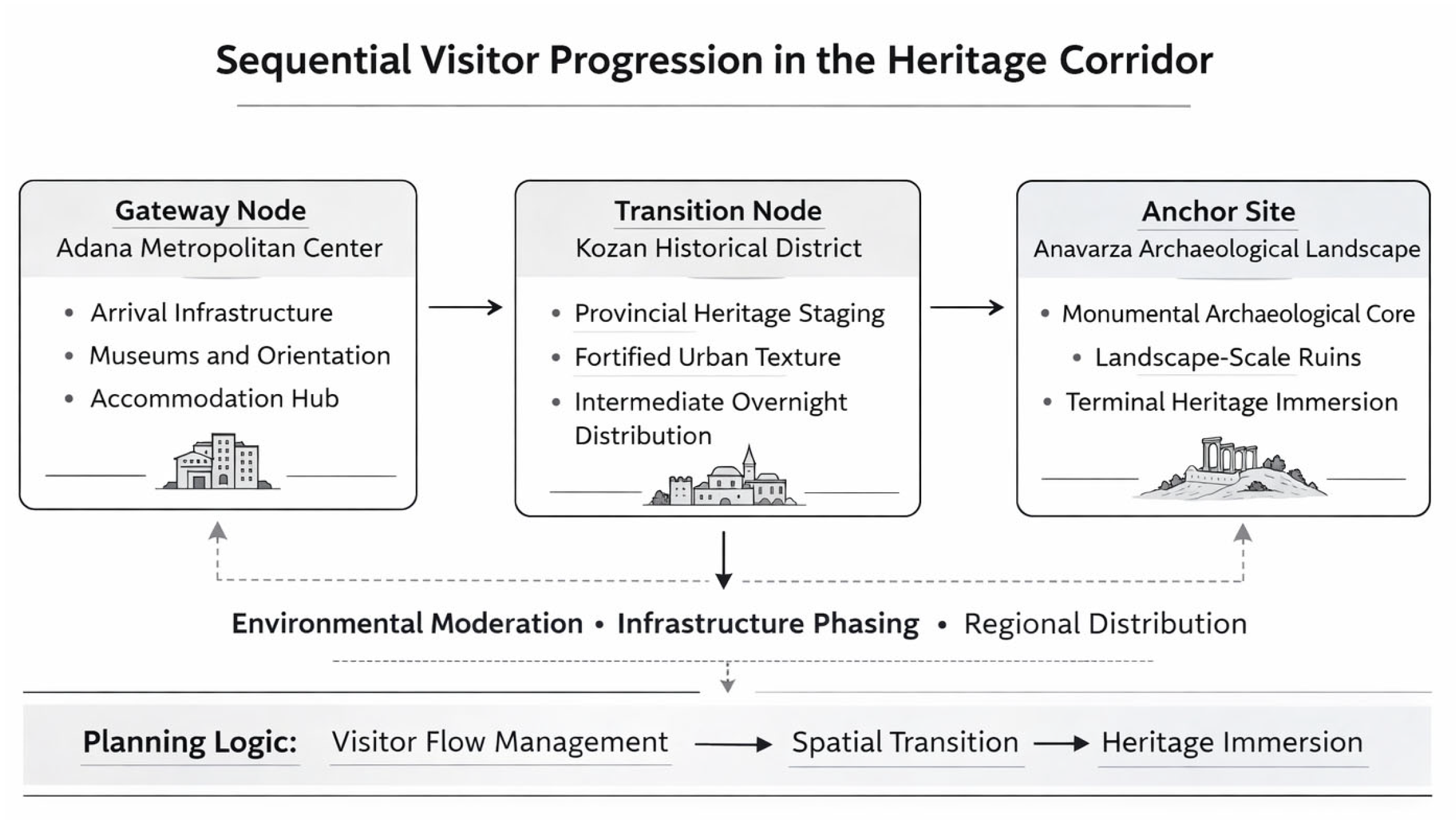 A three-node configuration was preferred over a simpler two-node structure because the intermediary settlement performs a distinct staging and buffering role that cannot be adequately fulfilled by either the metropolitan gateway or the archaeological anchor alone. In this configuration, Adana functions as the primary gateway concentrating regional access and metropolitan-scale services, Kozan operates as a transitional staging node providing interpretive continuity, overnight accommodation, and spatial redistribution, and Anavarza remains the conservation-sensitive archaeological anchor. This hierarchical differentiation improves sequential feasibility, reduces direct pressure on the anchor landscape, and enables a more balanced corridor organisation than a direct gateway-to-anchor linkage. The proposed configuration is therefore not presented as a universal optimisation formula, but as a planning logic demonstrating why an intermediate node becomes functionally necessary in this case.