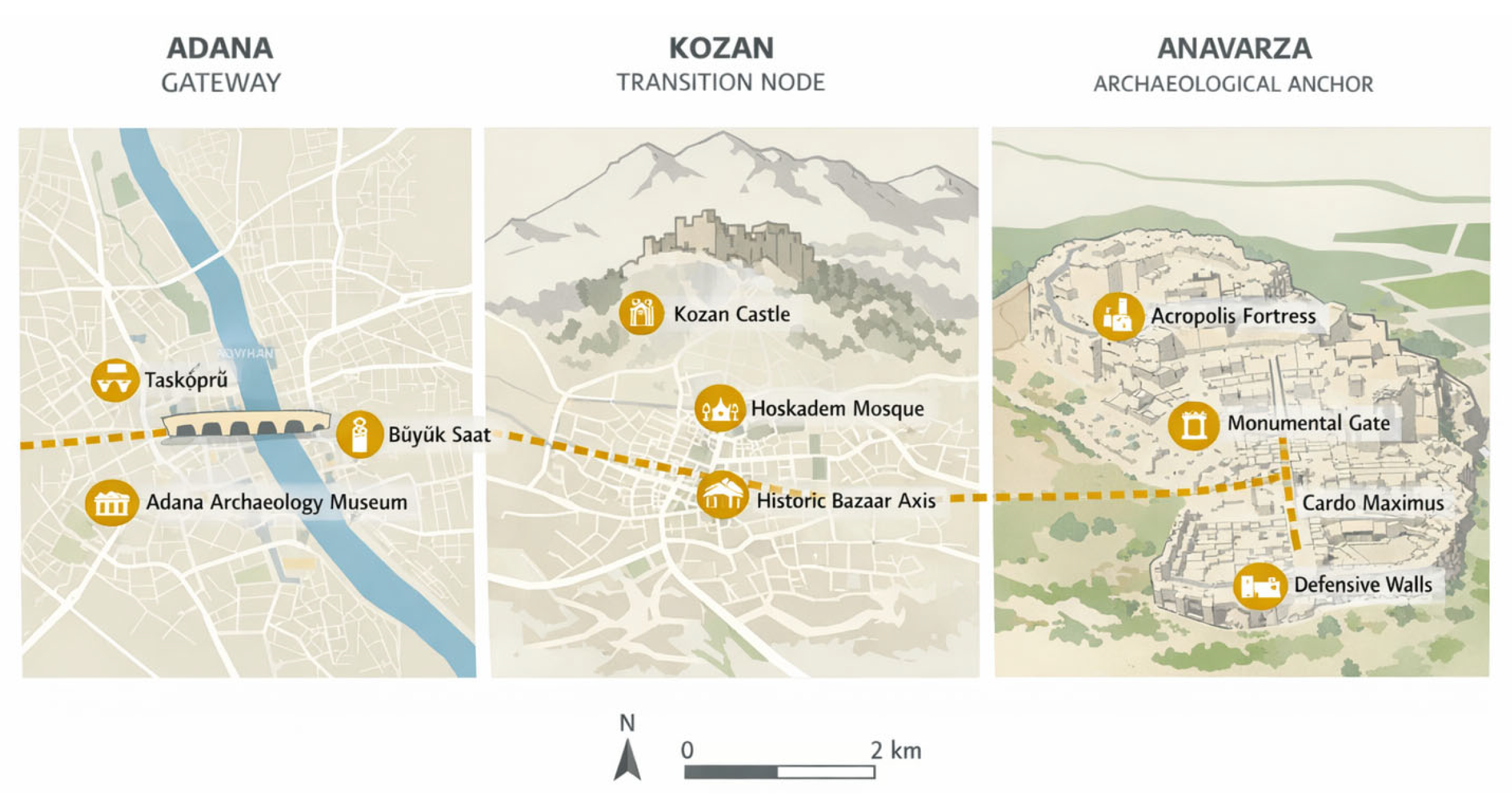 Figure 6. Detailed spatial representation of the hierarchical corridor linking the urban gateway (Adana), the intermediate transition node (Kozan), and the archaeological anchor site (Anavarza), illustrating major heritage assets and their integration within the staged mobility system.