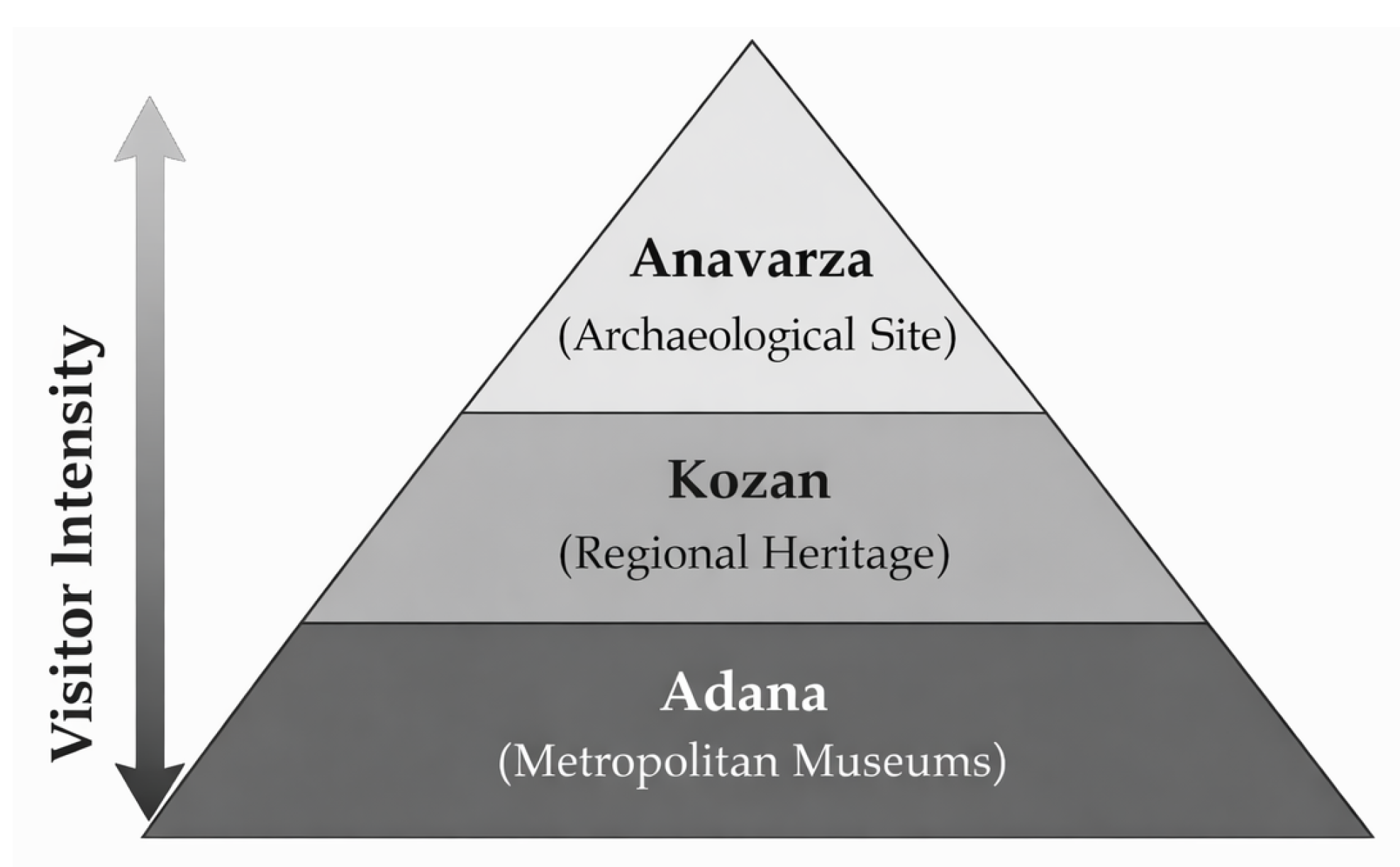 Figure 7. Conceptual qualitative visitor-intensity hierarchy of the Adana–Kozan–Anavarza corridor nodes.
