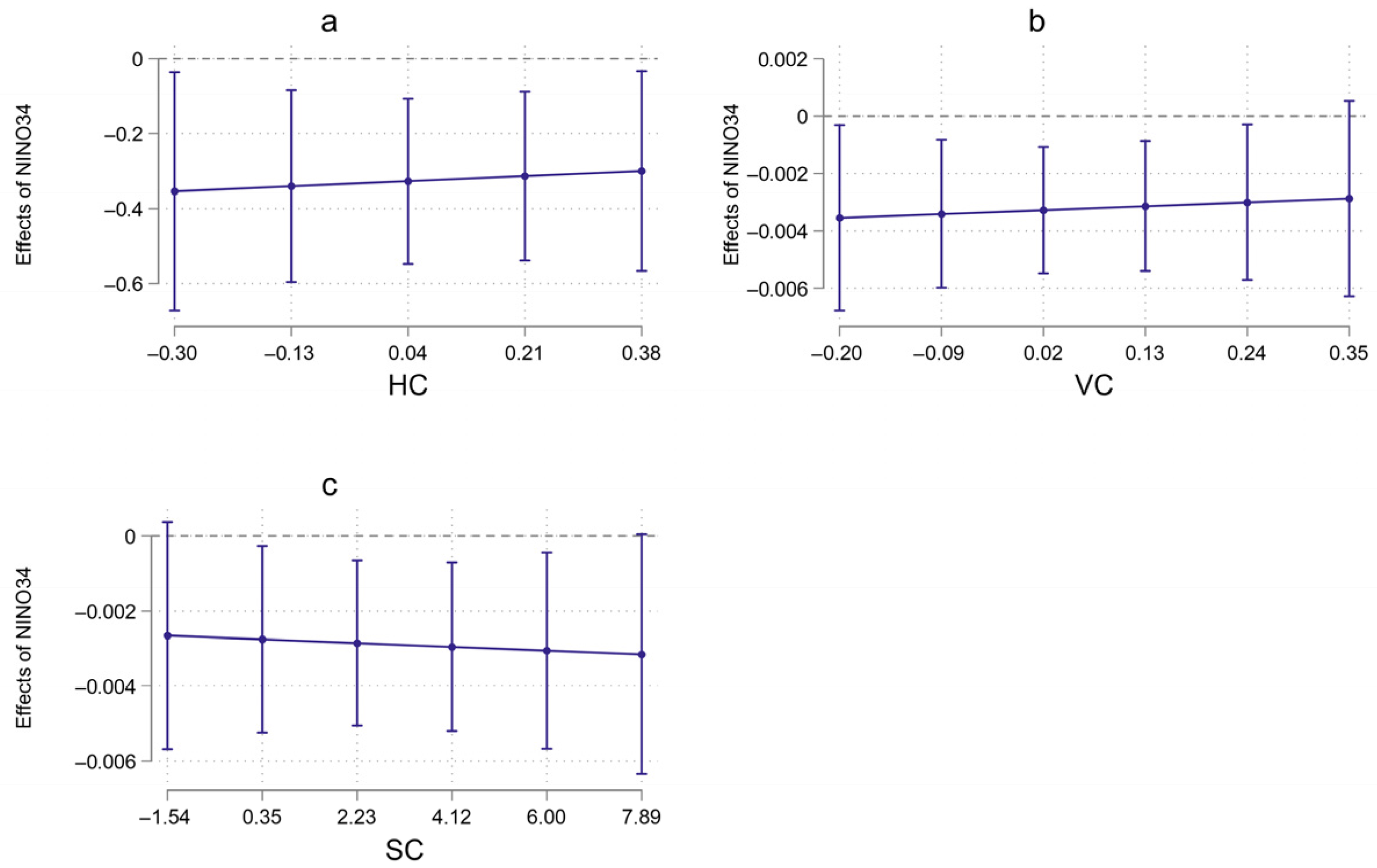 | NINO34 | −0.144 * | −0.128 * | −4.302 ** | −0.183 ** | −0.00 * | −0.001 * |