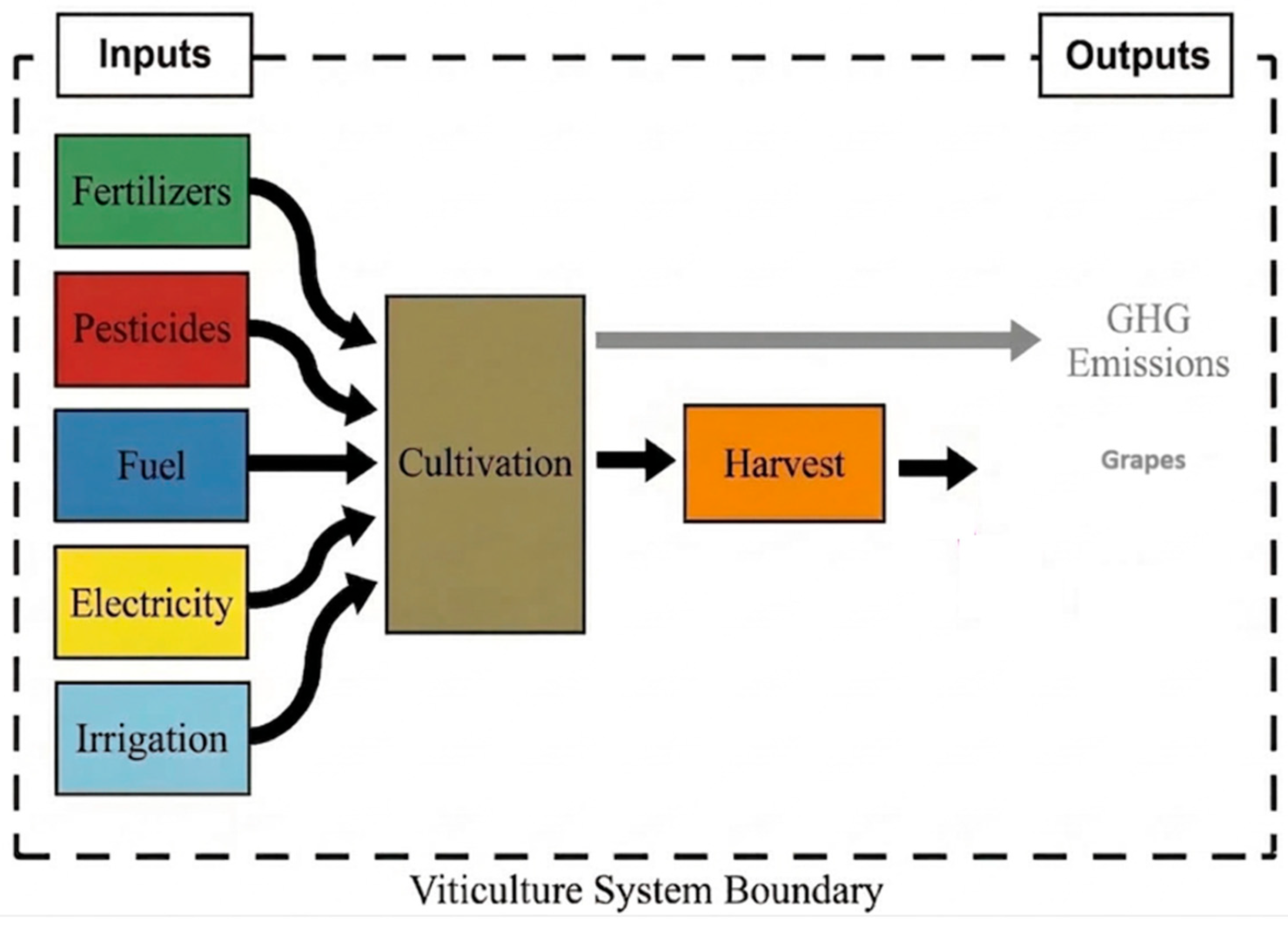 The primary objective of this study is to calculate the CF of wine grape production and identify the processes that contribute most to climate change. The methodological framework of this analysis is in compliance with the international standards ISO 14040, ISO 14044, and ISO 14067 [
