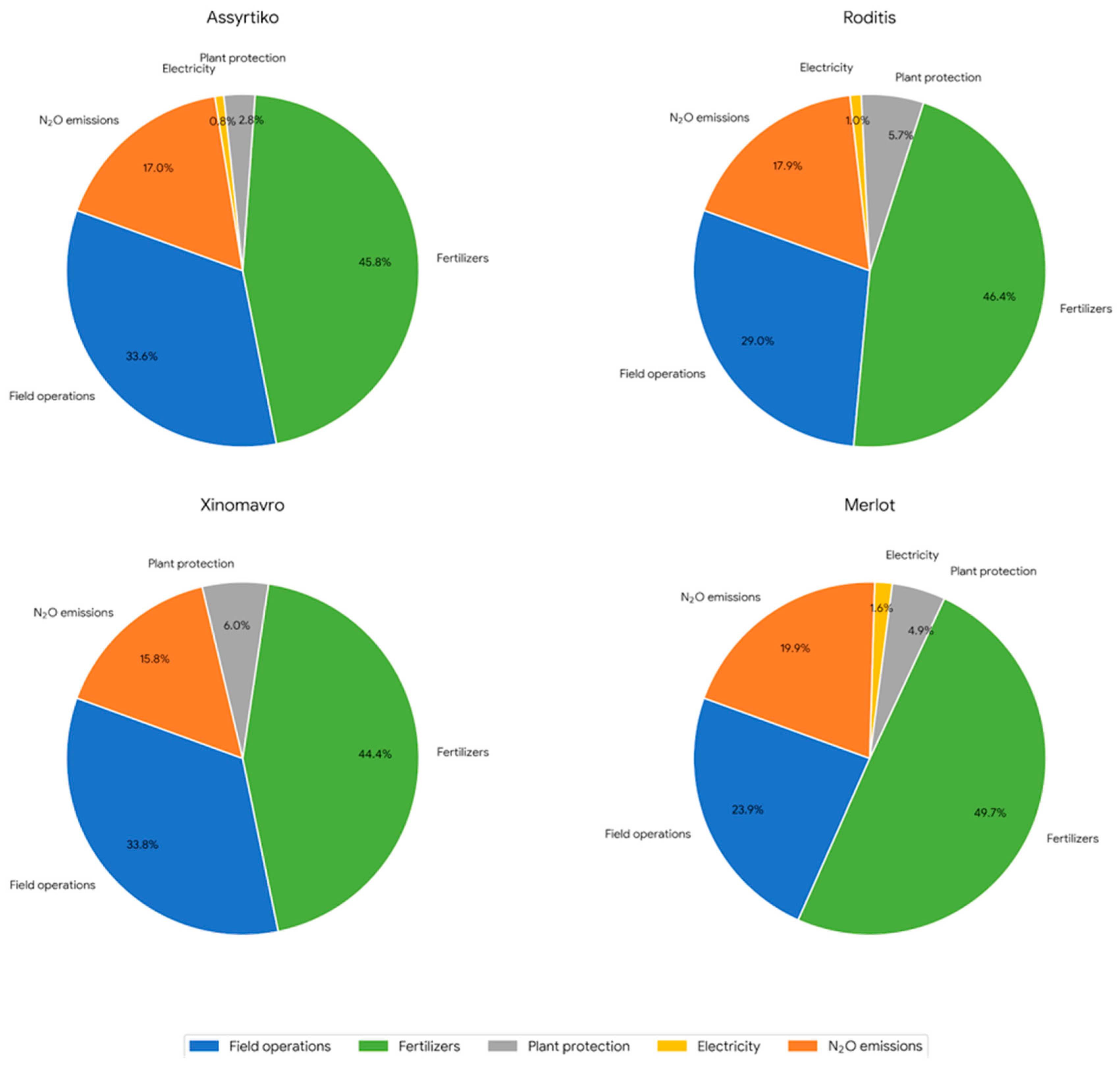 38] in a winery in Northern Greece, where the vineyard contributes 32% to the total carbon footprint. In contrast, the winery dominates with 68%, mainly due to high energy requirements and the use of refrigerants. However, internal analysis of the vineyard revealed that plant protection products (PPPs) are responsible for a staggering 79% of emissions at this stage. This is attributed to the particularly high emission factor of agrochemicals, highlighting them as the main factor of environmental impact in the field. Specifically, a similar picture to that of Paionia and the wider region of Northern Greece [