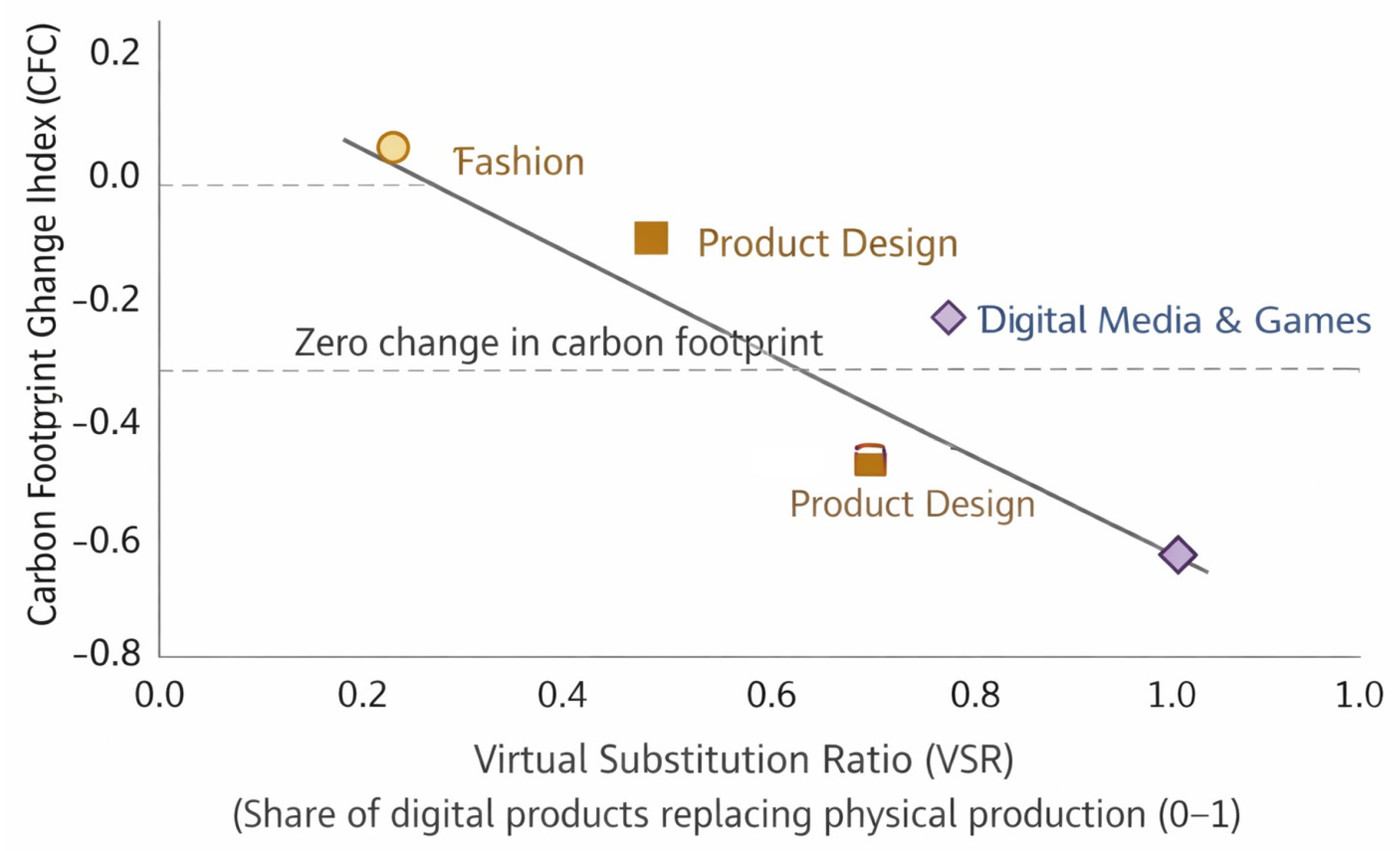 Established, the practices of digital fashion and virtual products possess significant potential for reducing the aggregate environmental footprint of creative industries. Correlation analysis revealed a moderate negative relationship between the share of virtual substitution (VSR) and the carbon footprint index (CFCI). However, this potential is realized only when using “green” digital infrastructure. Energy-intensive technologies, such as Proof-of-Work blockchains, can completely negate the positive environmental effect, turning digitalization from a solution into a source of new environmental problems.