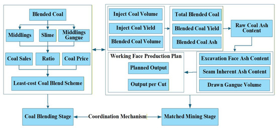 A reverse decision-making methodology is proposed for whole-lifecycle coal quality management by innovatively constructing a synergistic mechanism that deeply integrates a surface coal blending optimization model driven by “calorific value–cost” with an underground matched mining model driven by “ash balance–reverse tracing.” This mechanism takes surface commercial coal quality targets as input, optimizes material proportions through an economic blending model constrained by calorific value, achieves the resource-oriented utilization of low-calorific-value by-products, and generates the raw coal output baseline required for the matched mining stage. Building on this, and based on the mass conservation relationship between the surface and underground ash content, a reverse mapping model from sales targets to working face process parameters is established. The approach accurately decomposes production tasks into executable parameters such as the number of cutting cycles, output per cut, and drawn gangue volume, thereby forming a closed-loop quality traceability system from the market end to the mining end (as shown in Figure 2).
