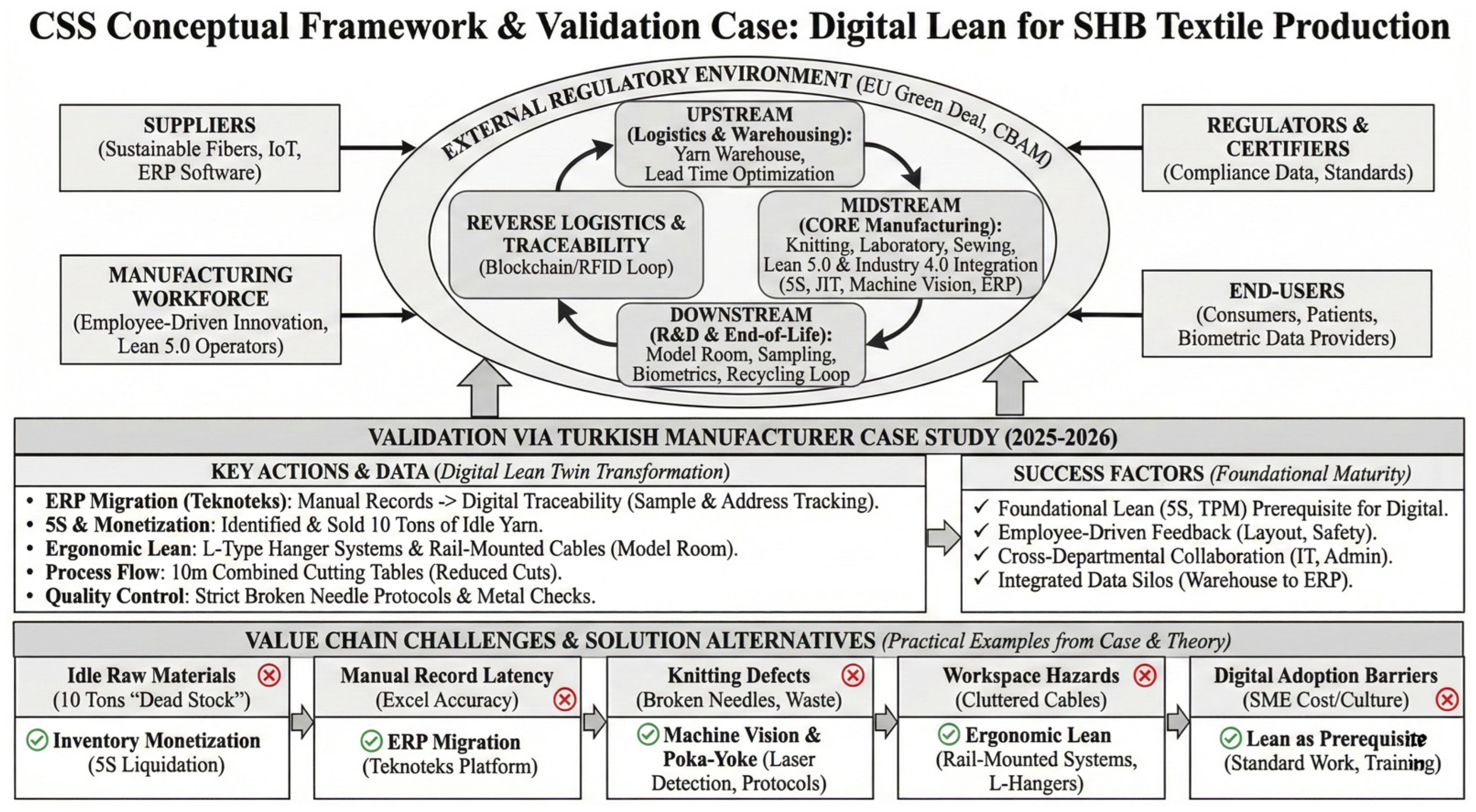 However, significant divergences emerged regarding the appropriate scale and scope of digital interventions. The narrative literature review heavily emphasized advanced, capital-intensive technologies, such as utilizing machine vision for defect detection or proposing blockchain for traceability. In contrast, the expert interviews, specifically the insights from İTHİB and İHKİB officials, revealed that such technologies present insurmountable initial capital expenditure barriers for SMEs in the Turkish SHB sector. This discrepancy was resolved in the final CSS framework by actively filtering out highly theoretical, cost-prohibitive technologies in favor of accessible, high-impact “Digital Lean” tools. The case study confirmed the validity of this resolution, demonstrating that adopting the Teknoteks ERP platform for sample tracking effectively eliminated data silos and improved customer revision transparency without requiring prohibitive infrastructural investments.