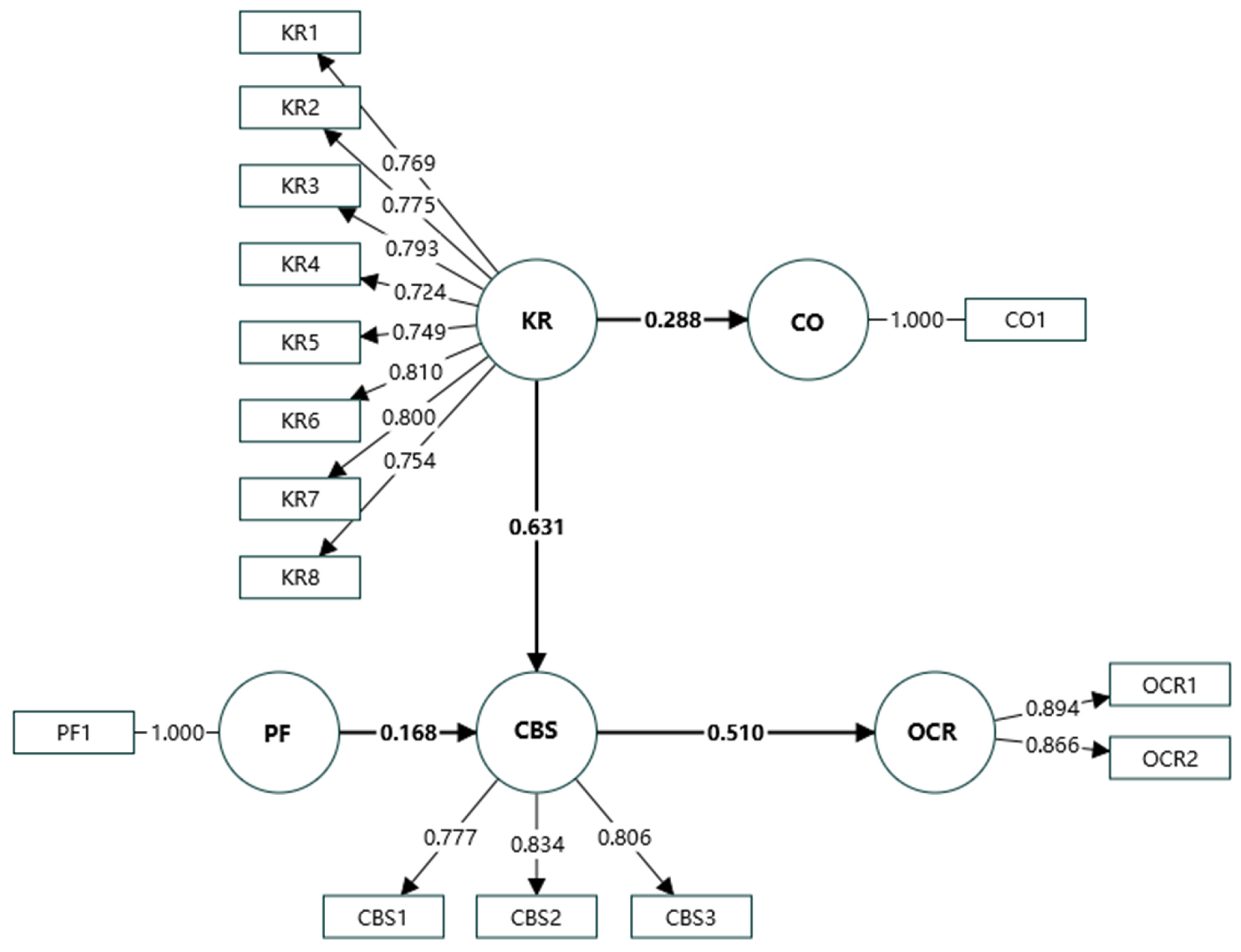 | KRs → CBSs → OCRs | 0.322 | 4.001 | 0.000 *** |