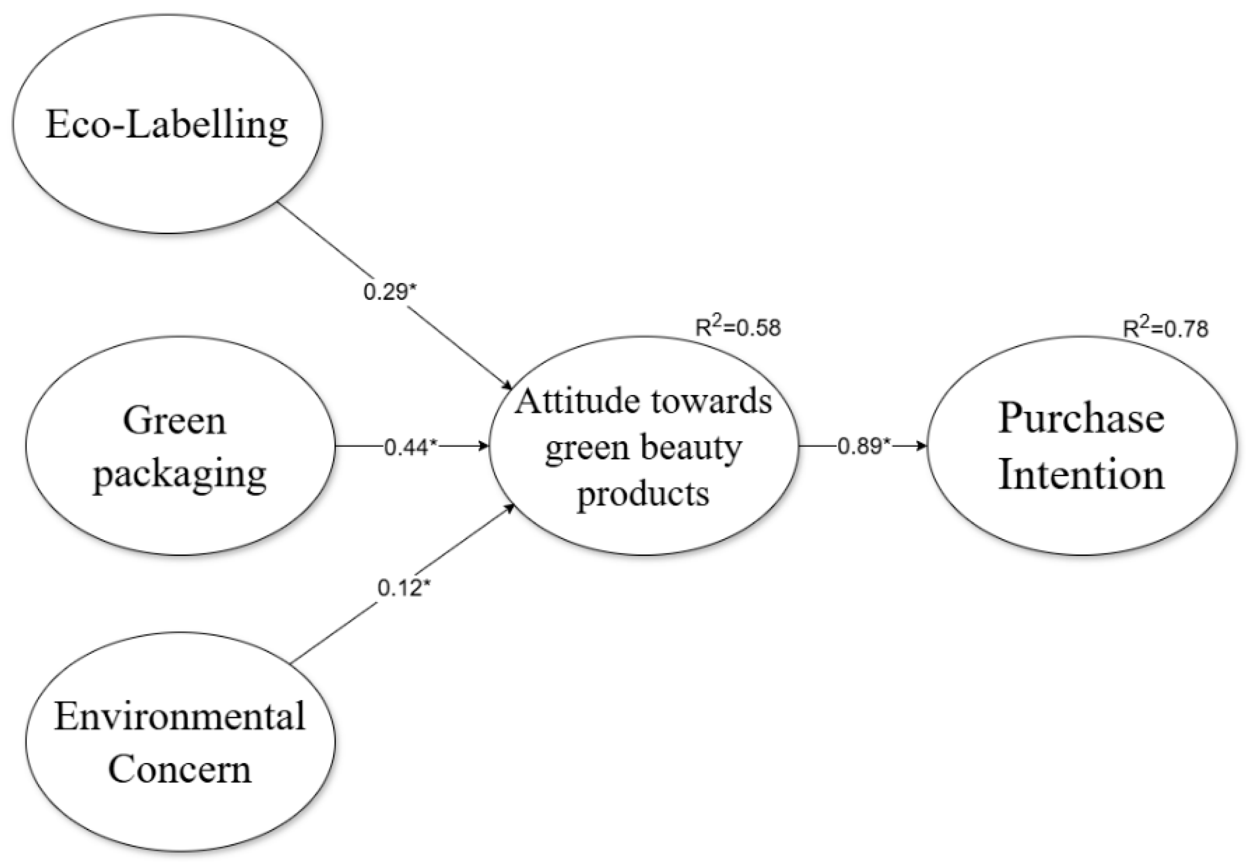 | Hypothesis (H4): Attitude toward green beauty products → Purchase intention | 0.89 | 0.000 ** | 0.84 | 0.92 | |