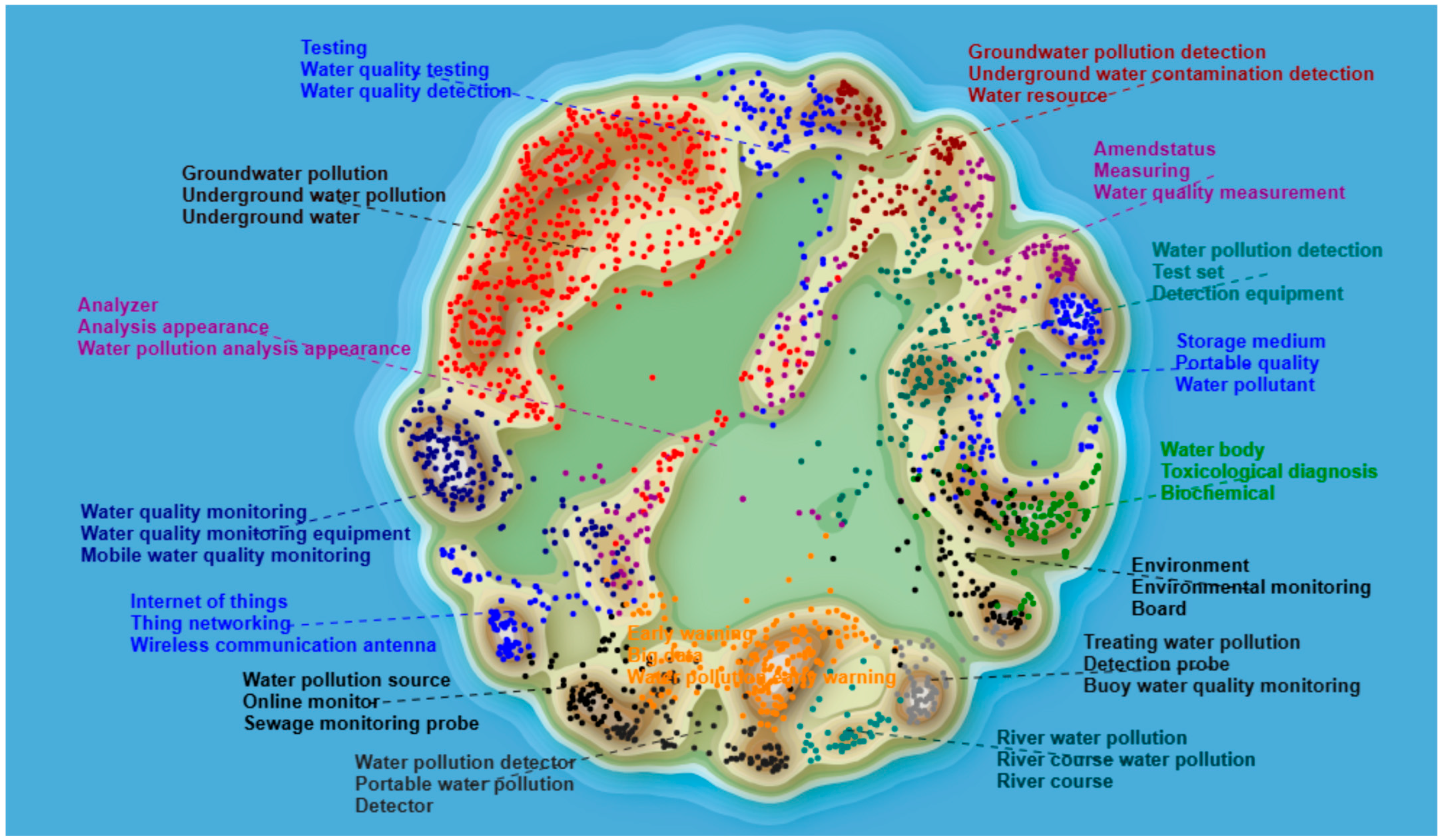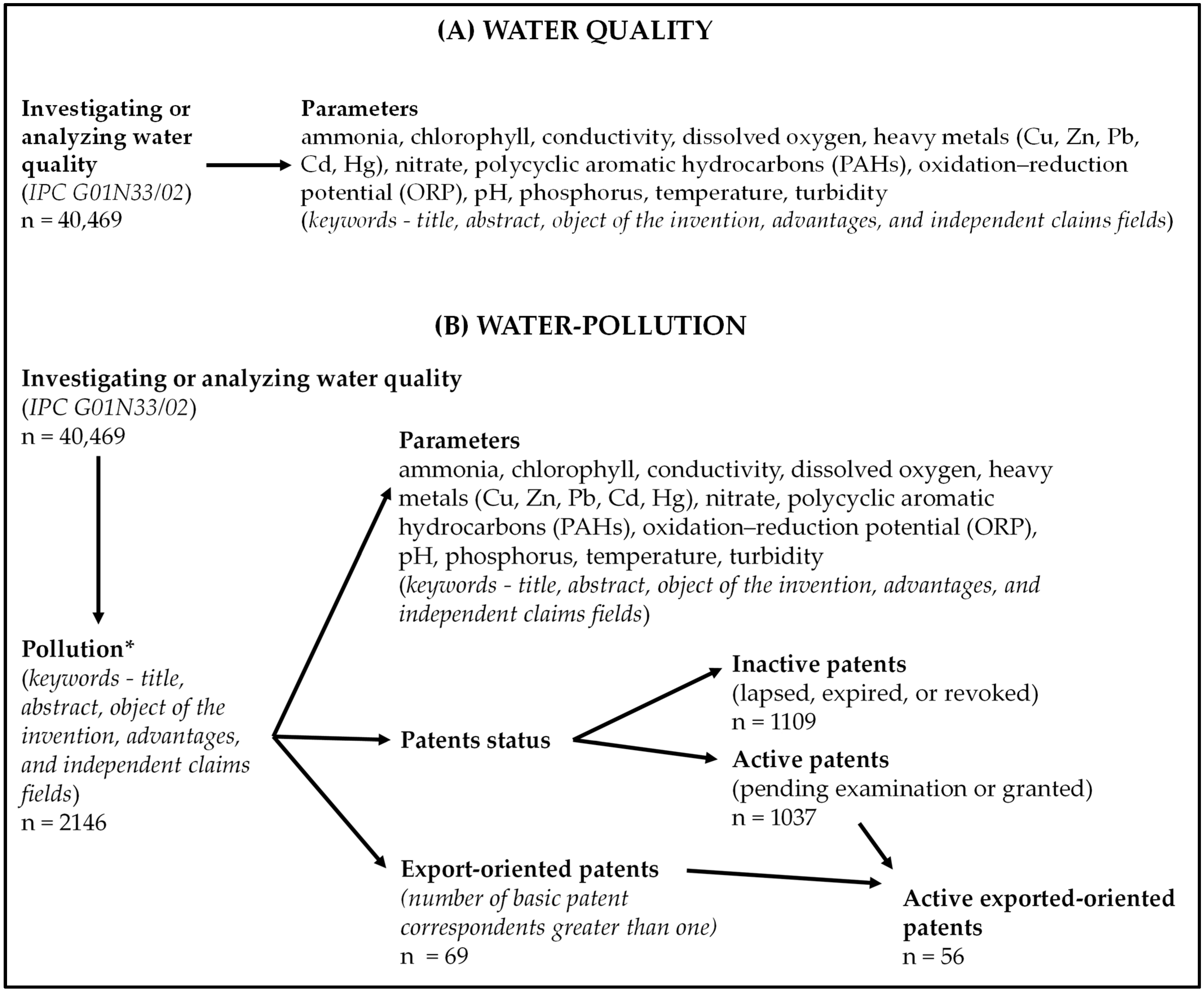 - How are patents distributed across the main water-quality and water-pollution parameters, and their associations?