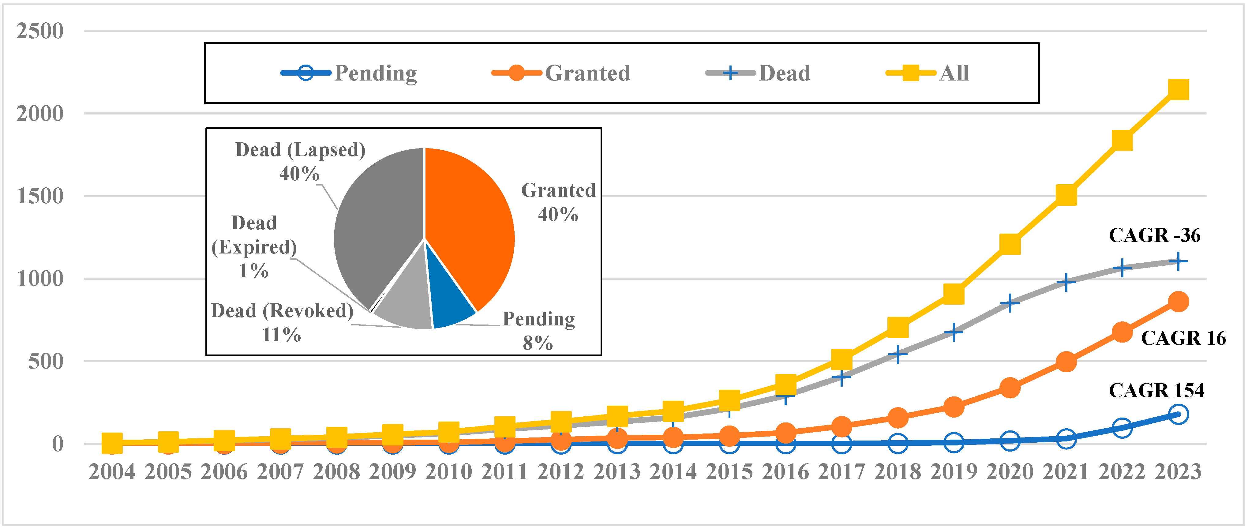 - What are the temporal trends and growth rates of patents, according to patent status?