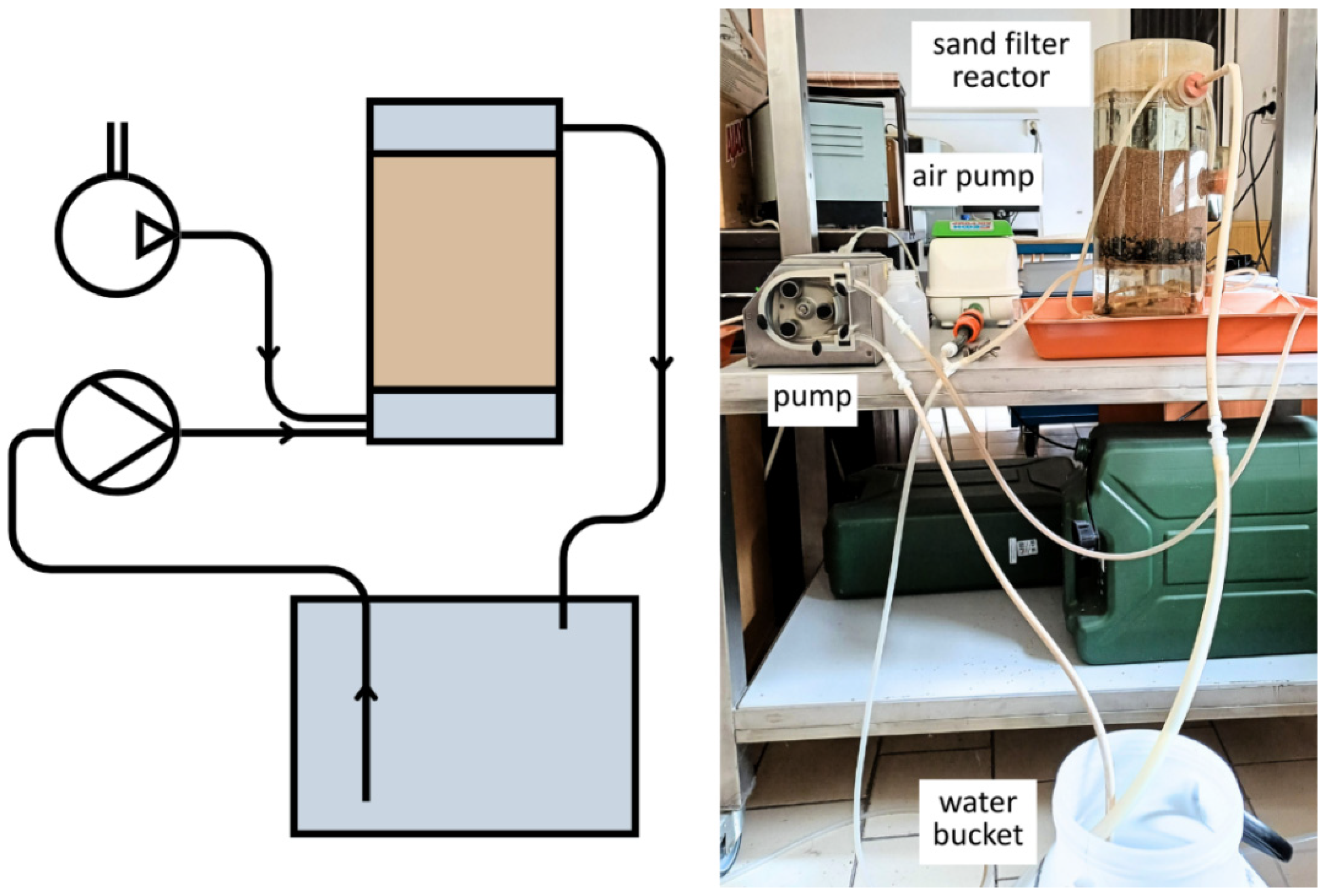 The WWTP effluent sample circulated from a 30 L bucket through a continuously aerated sand filter with an empty bed volume of 5 L. As the filling, waterworks sand was used with a particle size of 1–2 mm and a specific area of 2500–4000 m
