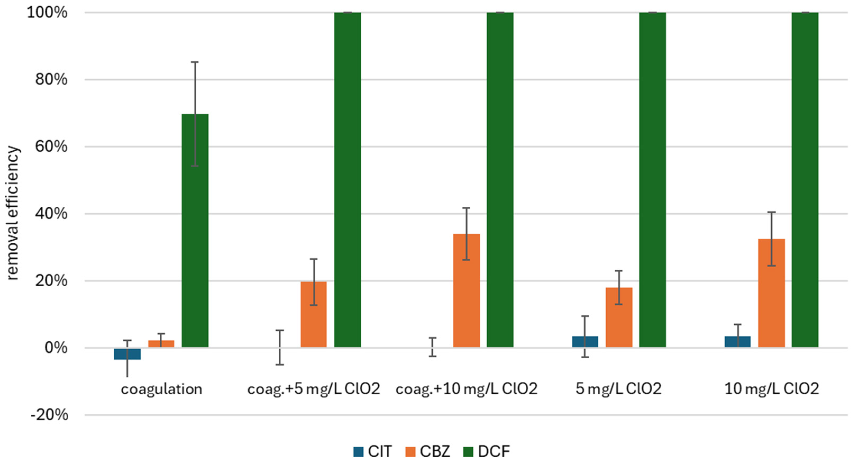 When combined, the efficiency recorded for CBZ and CIT changed dramatically. While the removal of CBZ reached up to 33.9%, depending on the ClO2 dose, no removal was effectively noticed when applied to CIT. This phenomenon could not be explained by any literature available and requires further research. In comparison, DCF removal efficiency remained at 100%.