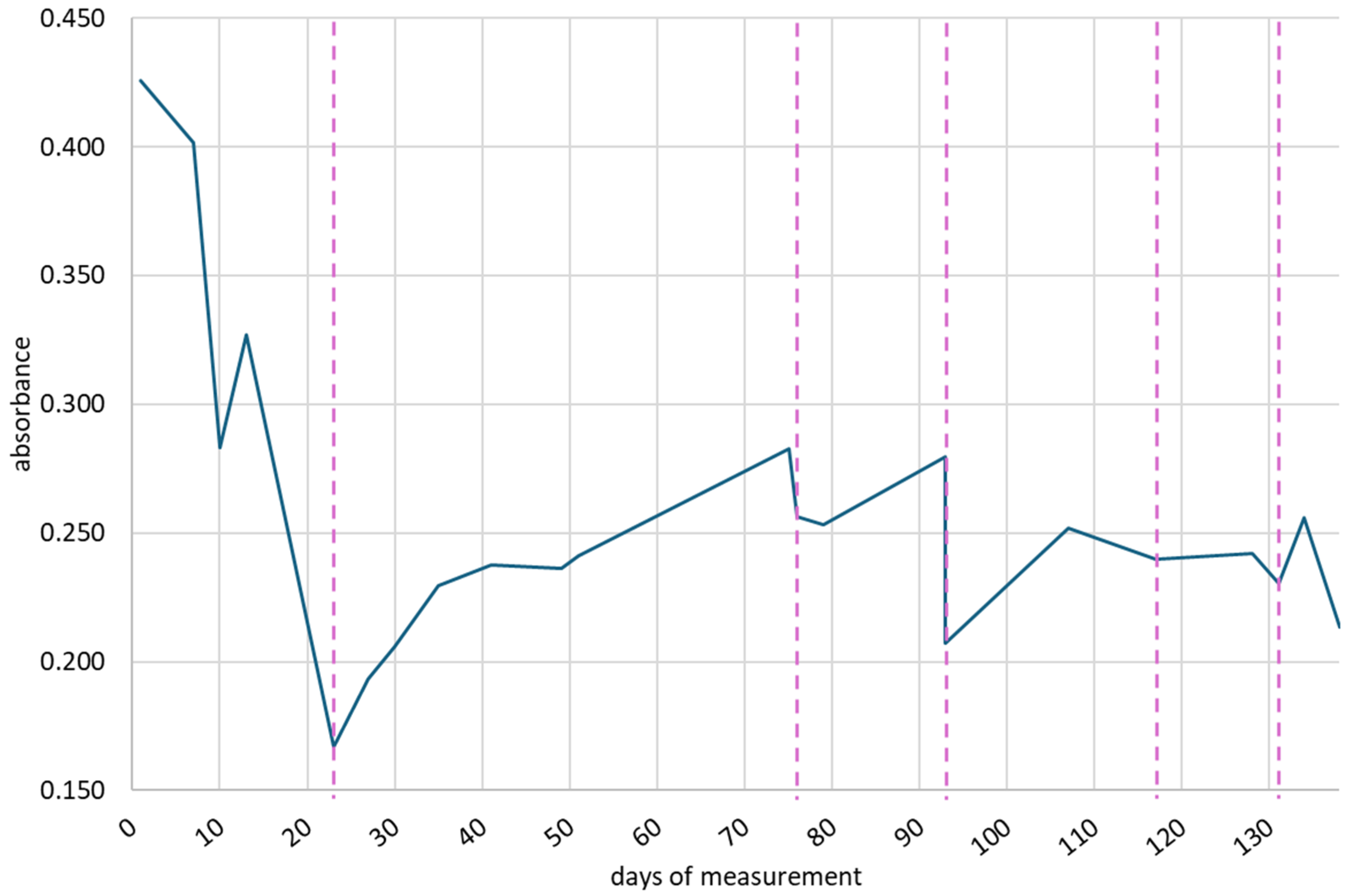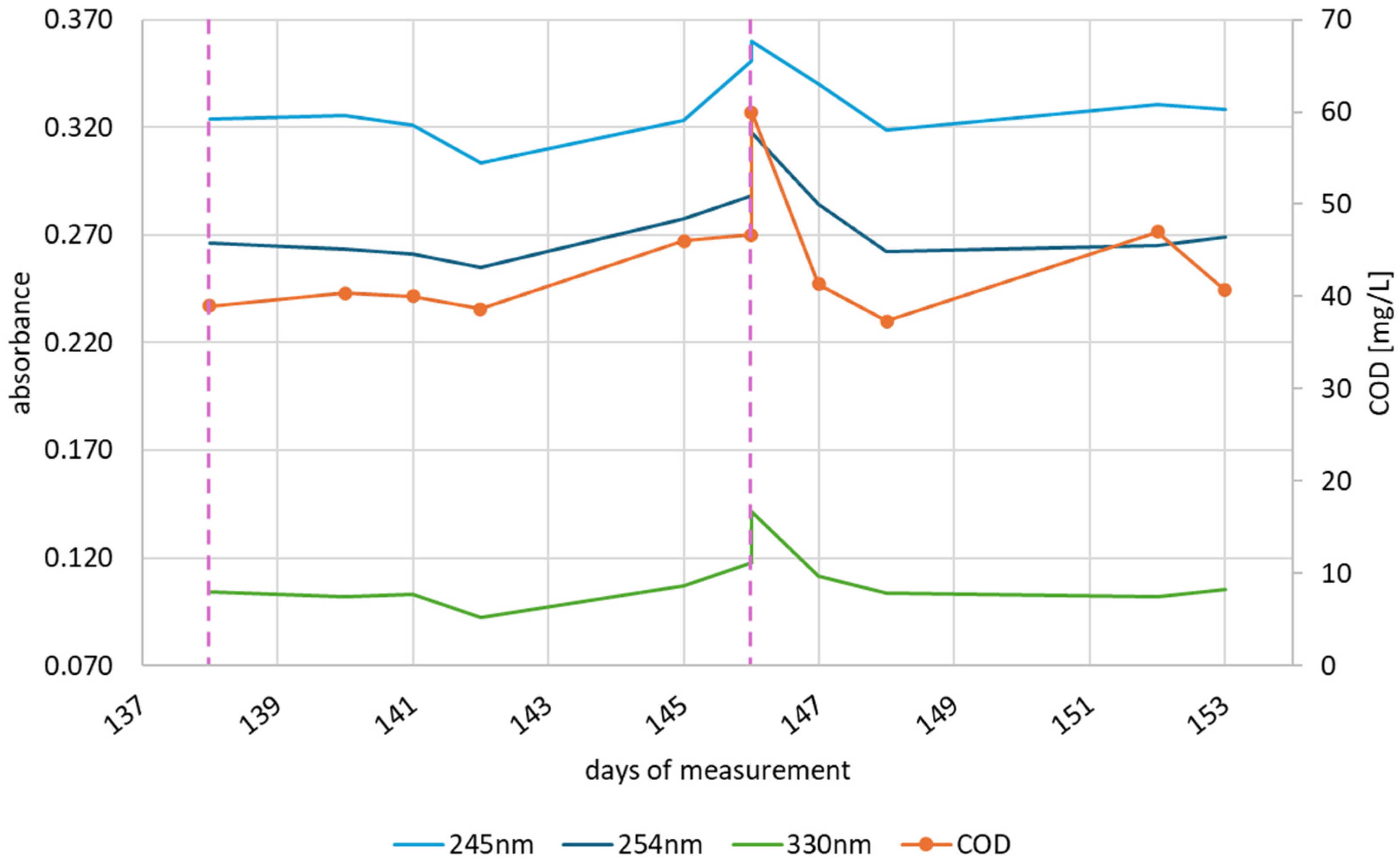 31]. The wavelengths were selected considering that nitrates and nitrites absorb at 200–220 nm, conjugated dienes and unsaturated aldehydes and ketones at 220–250 nm, and generally, organic matter absorbs at 250–380 nm, and turbidity is observable at 380–750 nm [