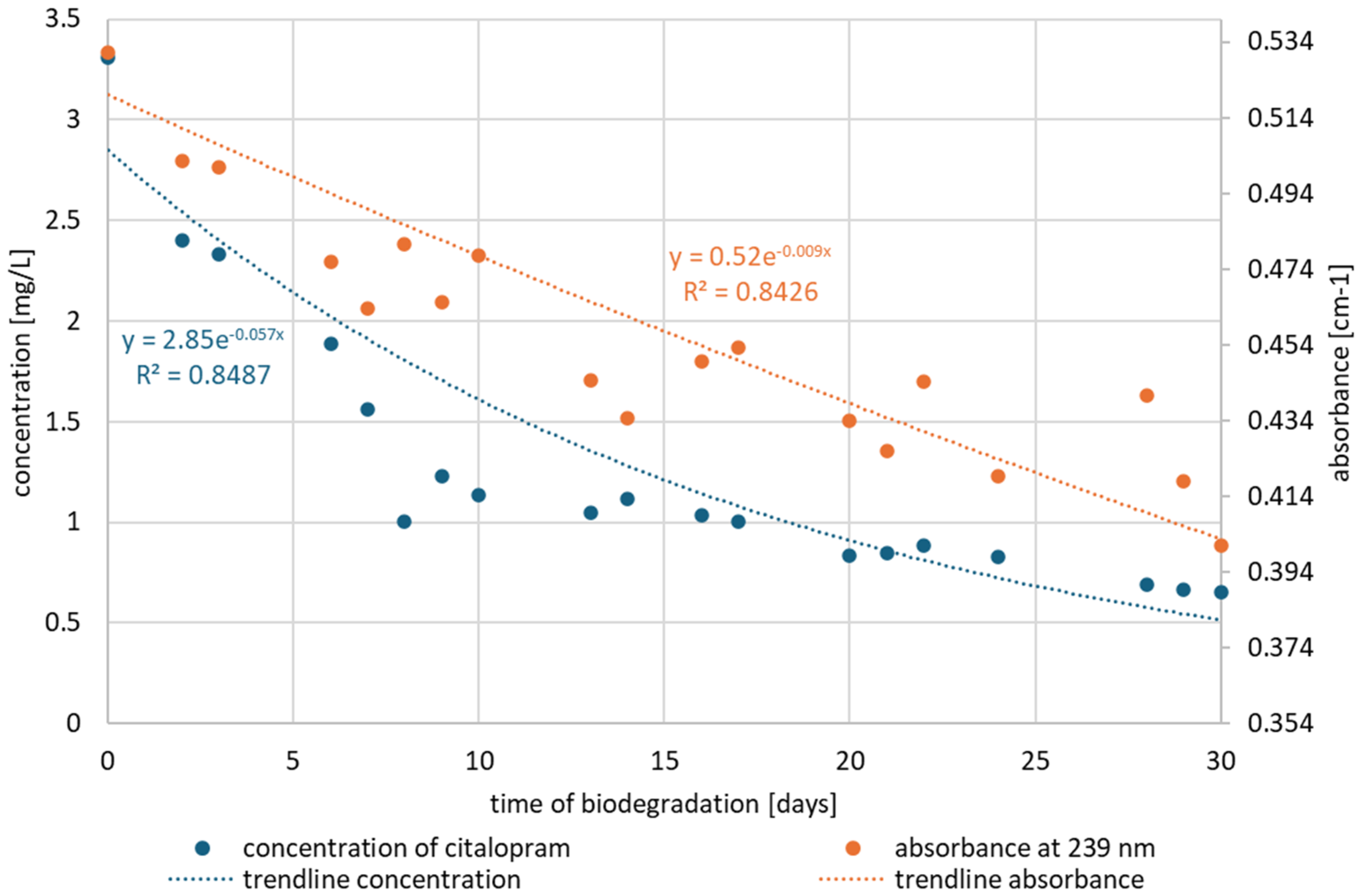 Experiments on the biofilm on the sand bed support have confirmed that only CIT is potentially biodegradable, while the other two micropollutants cannot be removed biologically. However, the rate of degradation of CIT was rather slow. This may have been caused by the low concentration of biomass, as the sand biofilter was not fully stabilized, and the high concentration of CIT present in the spiked water in amounts greater by several orders of magnitude than detected in actual wastewater (units of mg/L vs. tens to hundreds of ng/L).