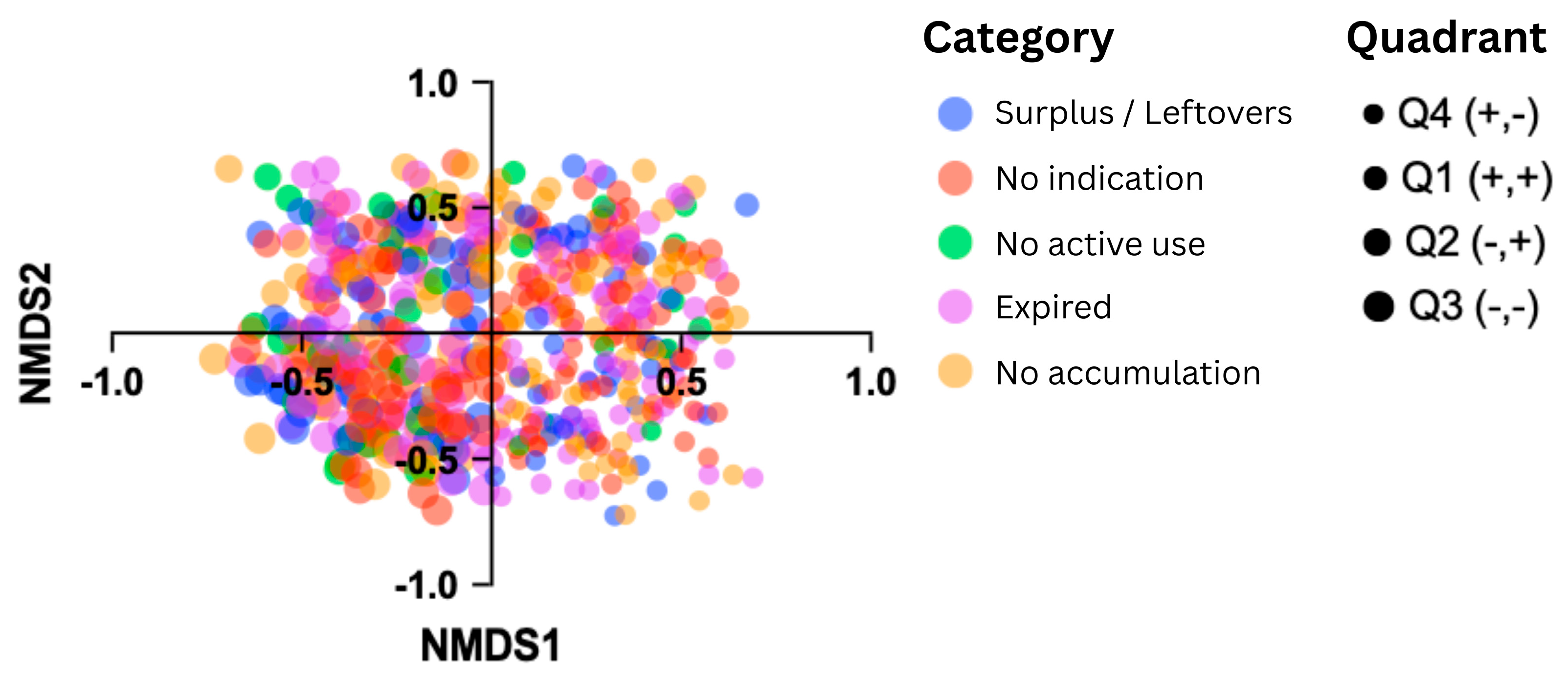 To identify patterns in household medication hoarding profiles, a multivariate analysis was performed using presence–absence data. A binary matrix was constructed for each household, including the four medication categories recorded (expired, leftover from incomplete treatments, discontinued by medical indication, and stored without current prescription). Therapeutic groups were not included in this matrix to avoid overfitting and to maintain focus on storage patterns. Ordination analysis was conducted using Non-metric Multidimensional Scaling (NMDS) with Bray–Curtis dissimilarity distances using PAST (version 4.03). The final two-dimensional solution yielded a stress value of 0.17, indicating acceptable model fit.
