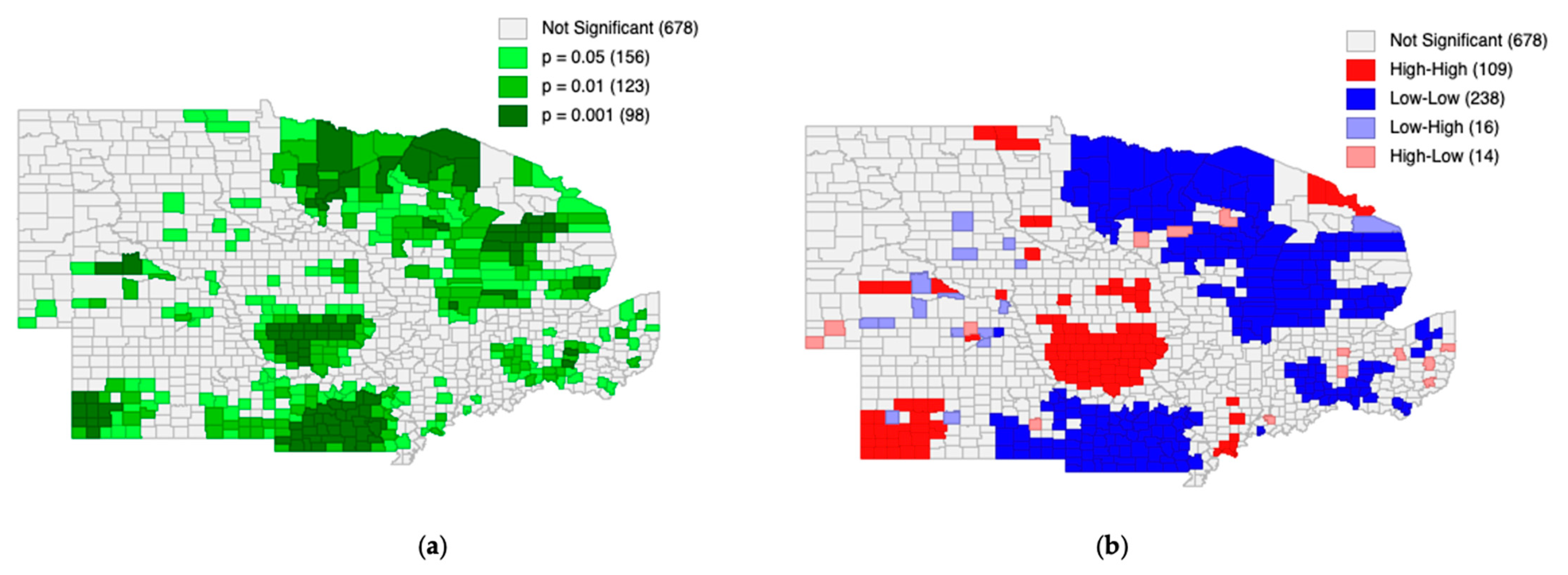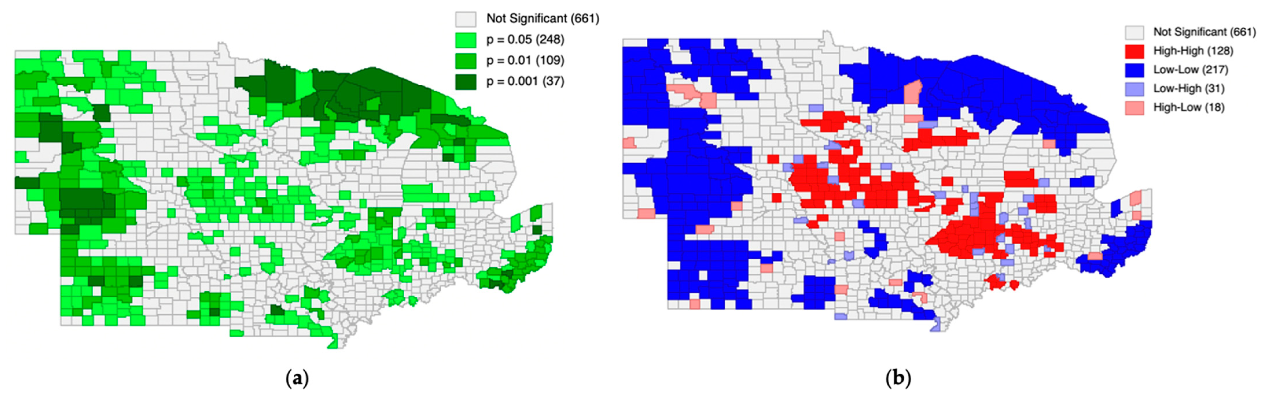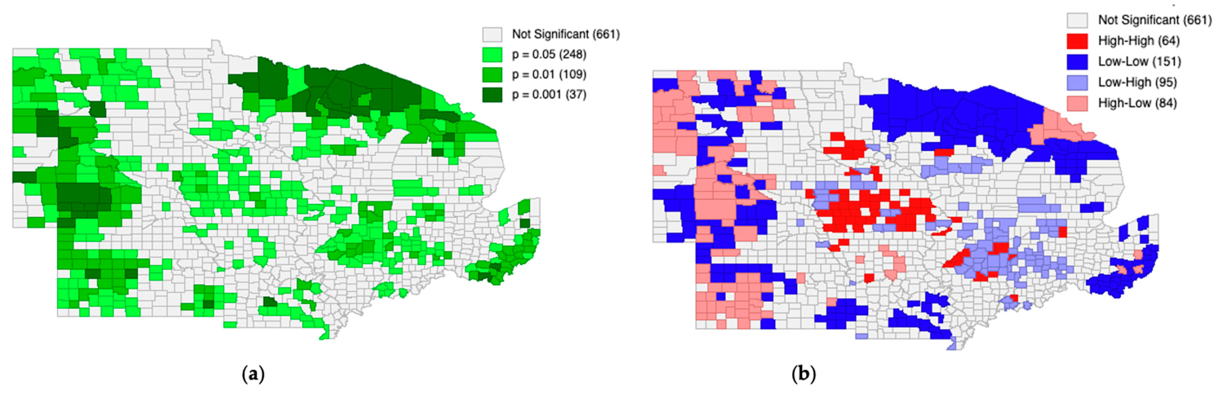 Figure 8a, large, spatially contiguous areas of significant counties are formed, indicating that a statistically significant CRP participation–CRP rental rate relationship operates systematically across the study region. This indicates that CRP participation patterns are spatially linked to rental rates in neighboring counties.