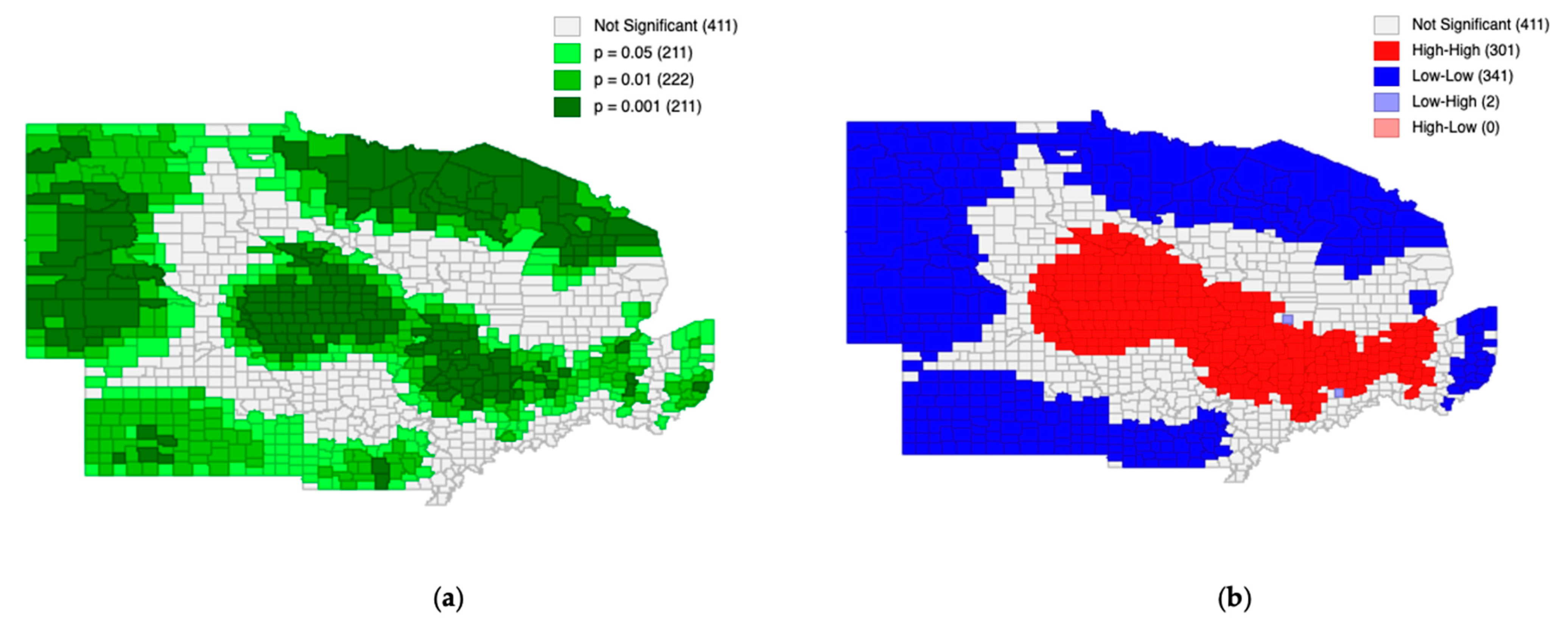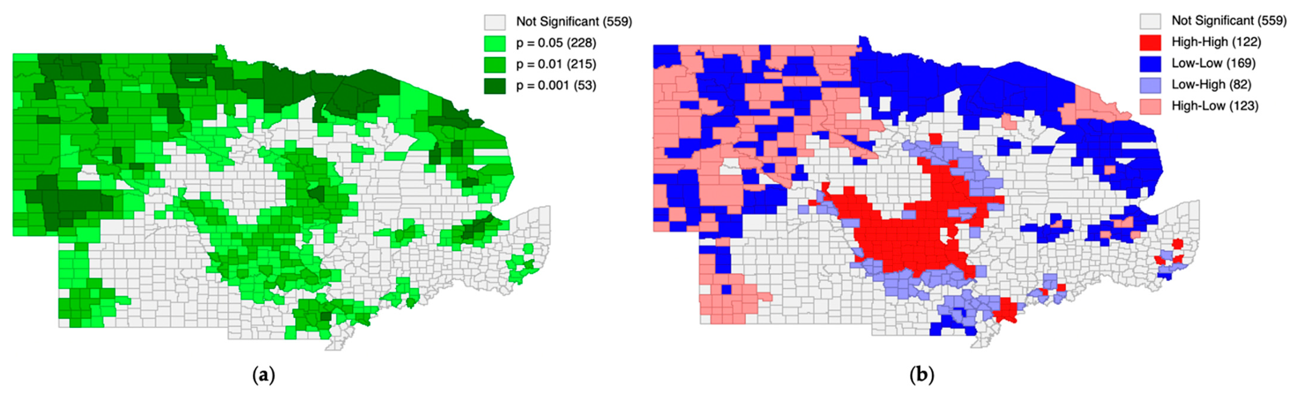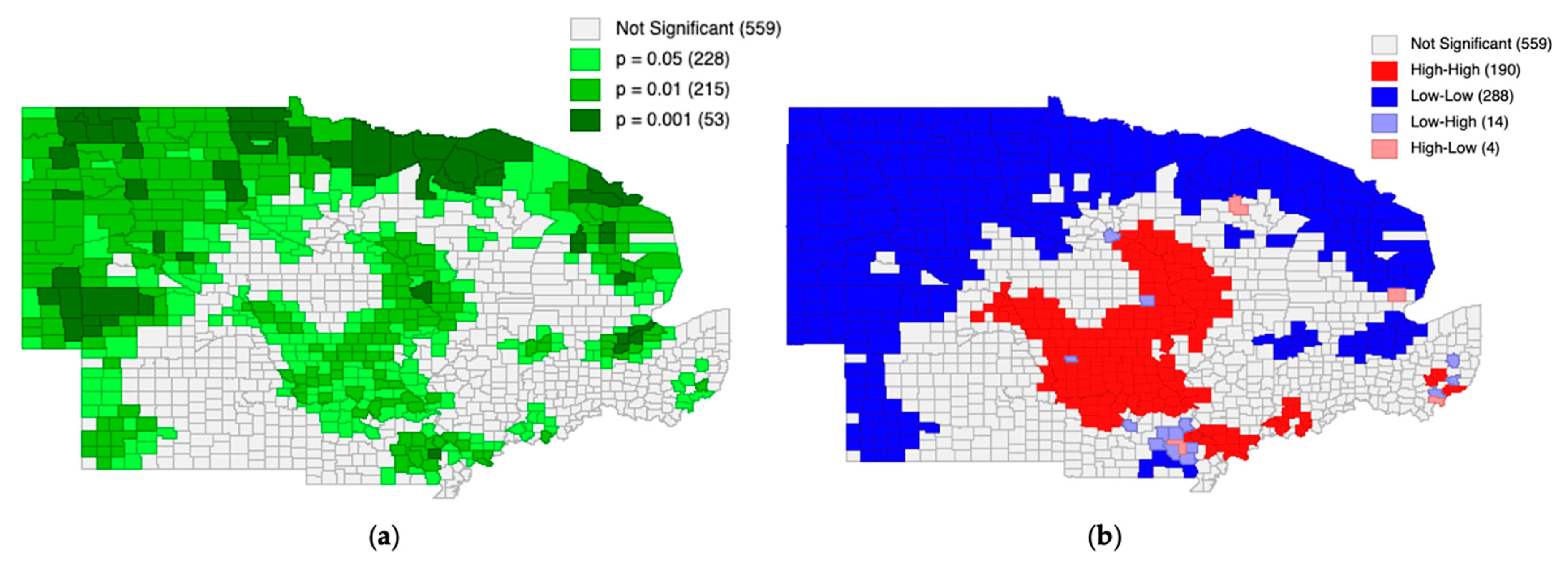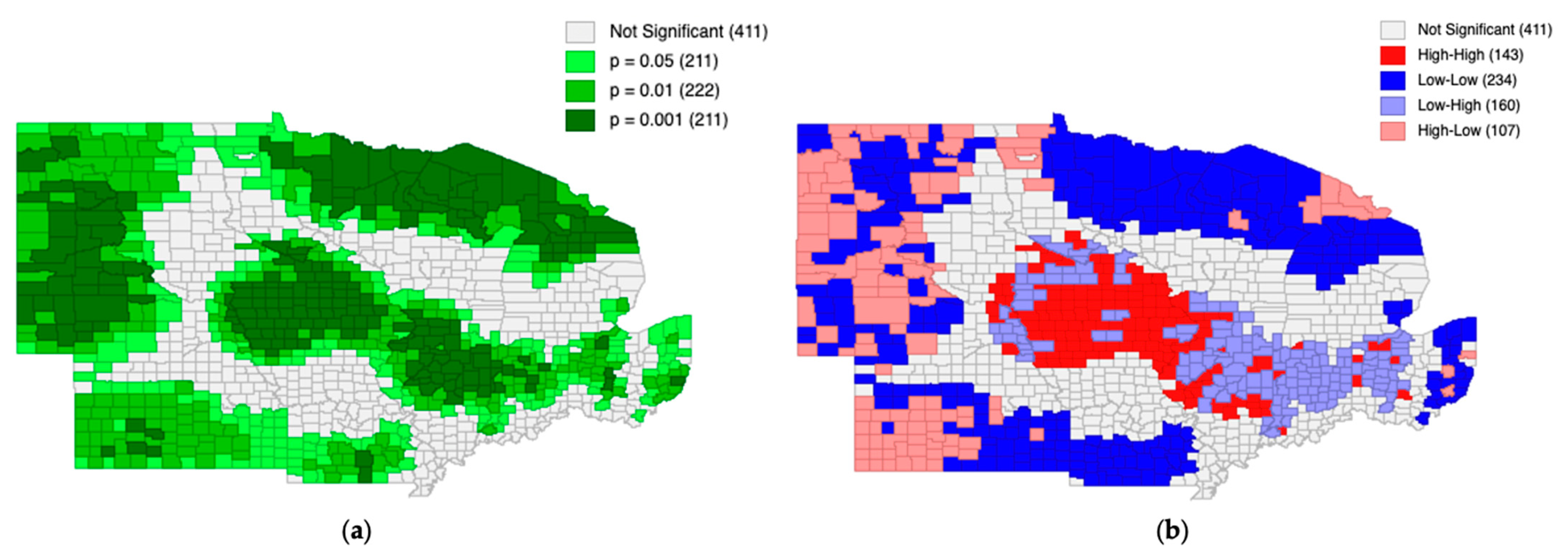 Table 4 reports the distribution of counties across HH, LL, LH, and HL clusters, along with the proportion of counties that were not statistically significant.